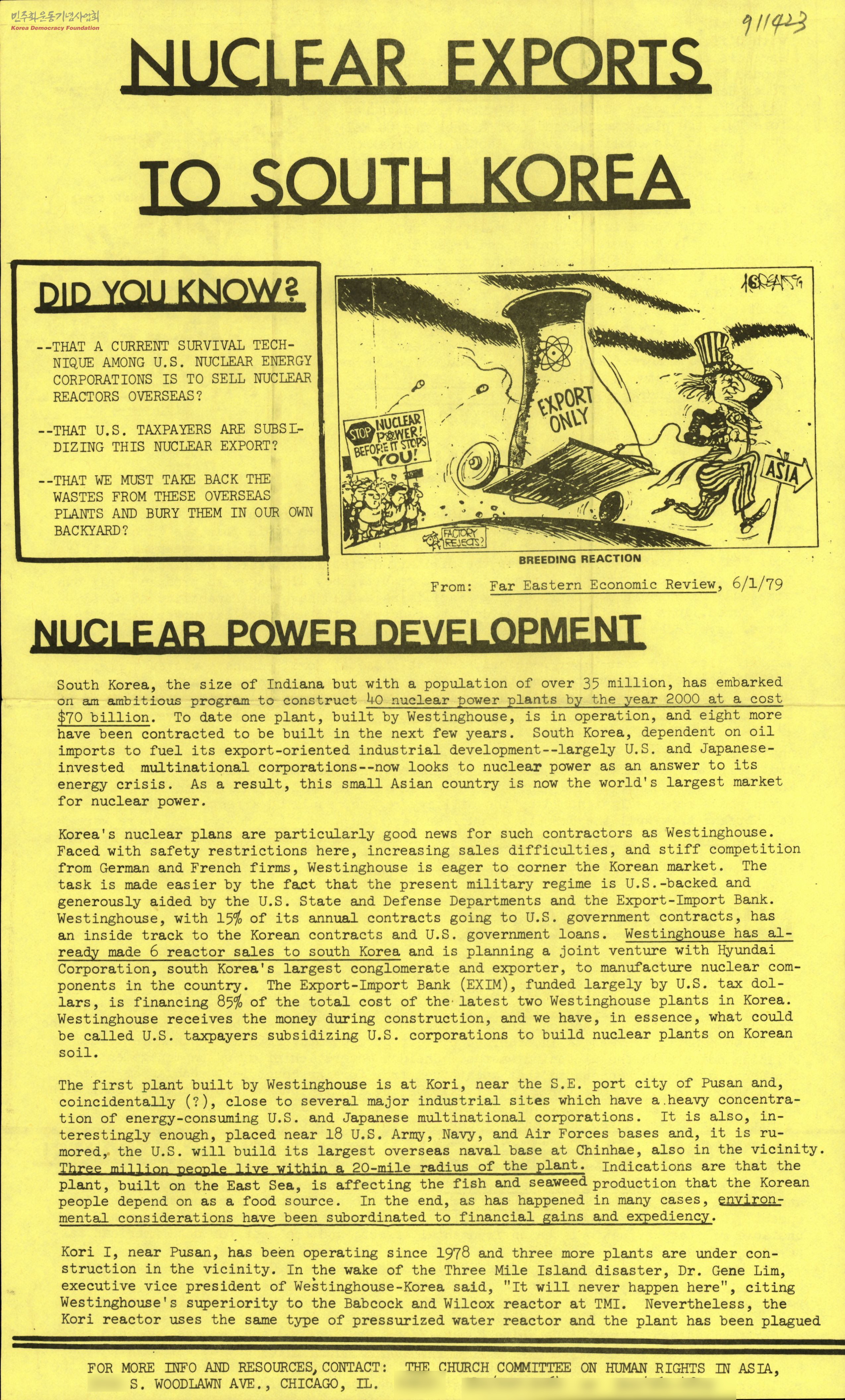 - 미국 정부의 한국에 대한 원자력 수출을 비판하는 반핵 전단지