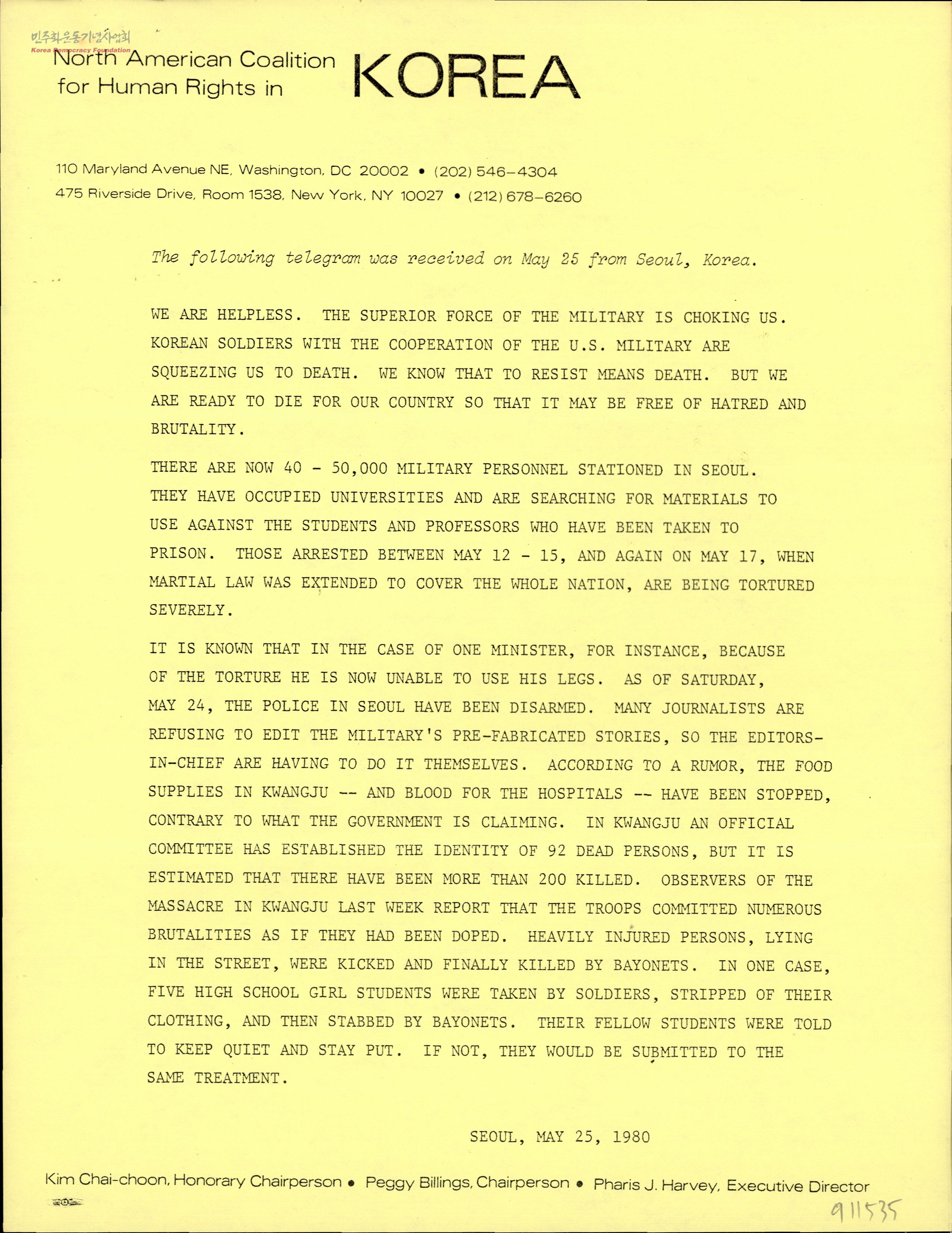 - NACHRK가 수신한 5.17 계엄령 전국 확대, 신군부의 가혹한 민주인사, 학생 체포, 고문, 투옥 상황의 실상을 알리는 전문 - <뉴욕타임스>와 <워싱턴포스트>의 광주 관련 기사 스크랩