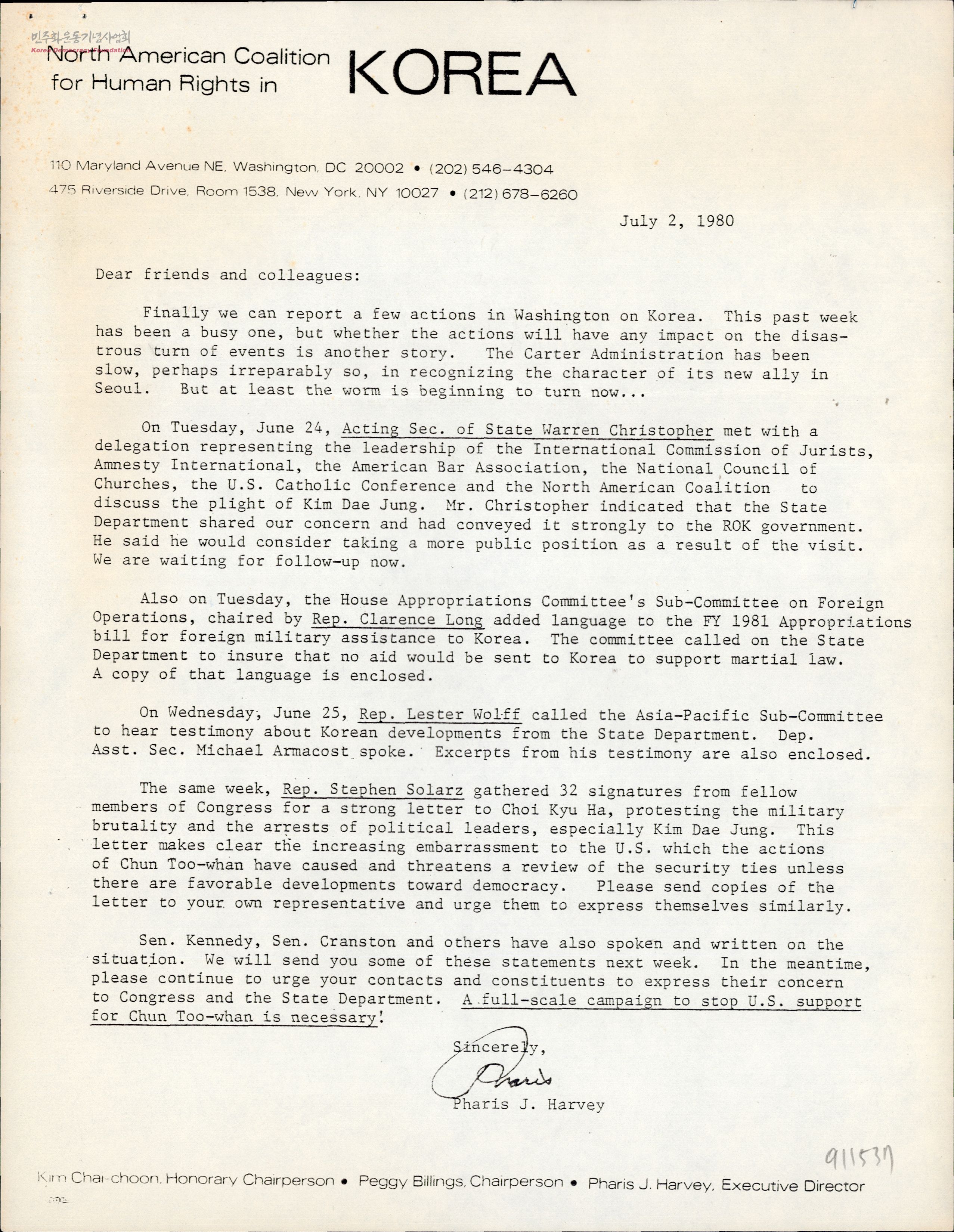 Pharis J. Harvey가 NACHRK 동료들에게 보낸 전두환의 쿠데타 폭거와 국민탄압 관련 편지, 미 의원들이 최규하에게 보낸 민주화 촉구 청원서, 외신 스크랩 묶음