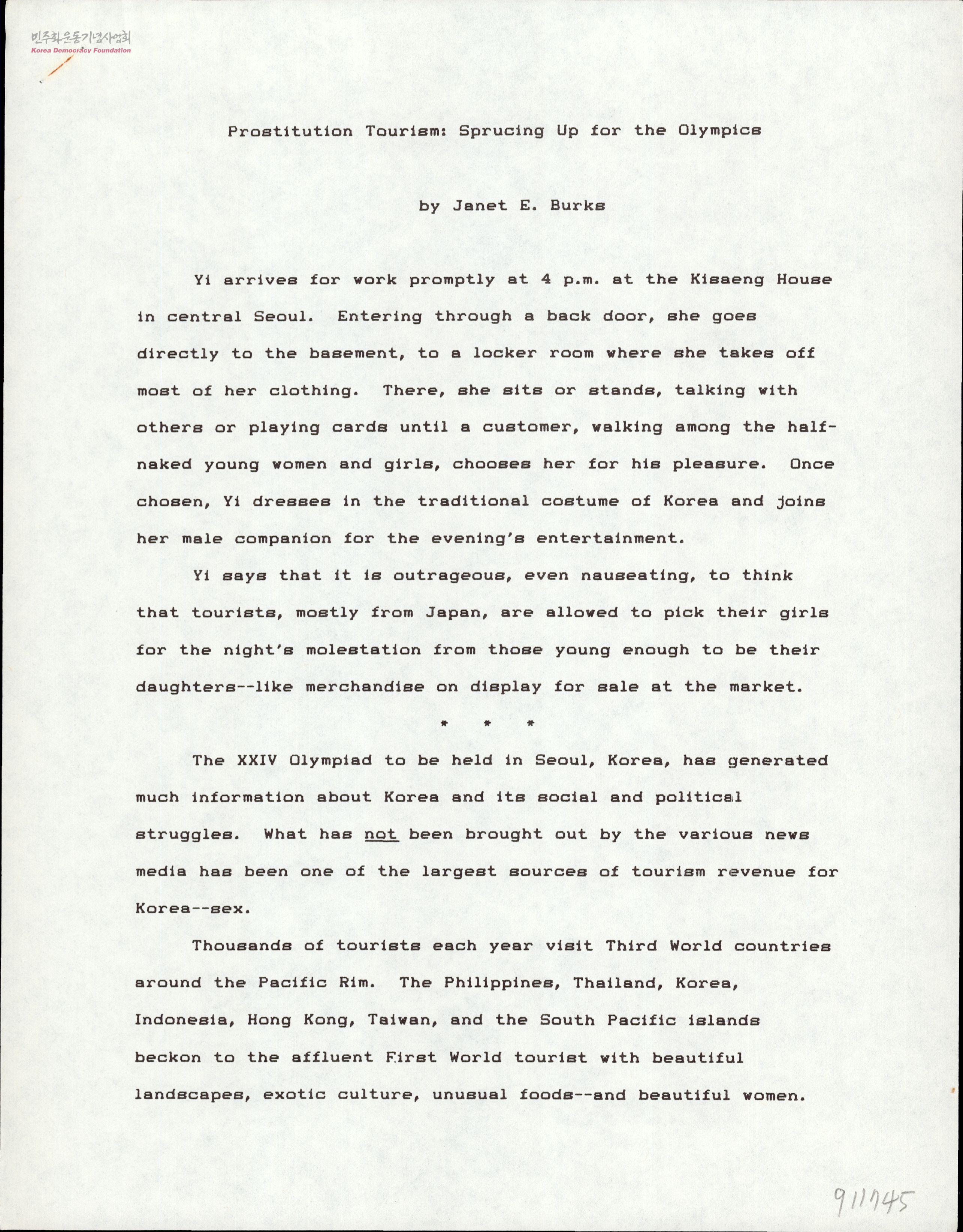 - 88서울 올림픽에 즈음해 한국의 기생관광으로 대표되는 매춘산업의 현장 실태보고