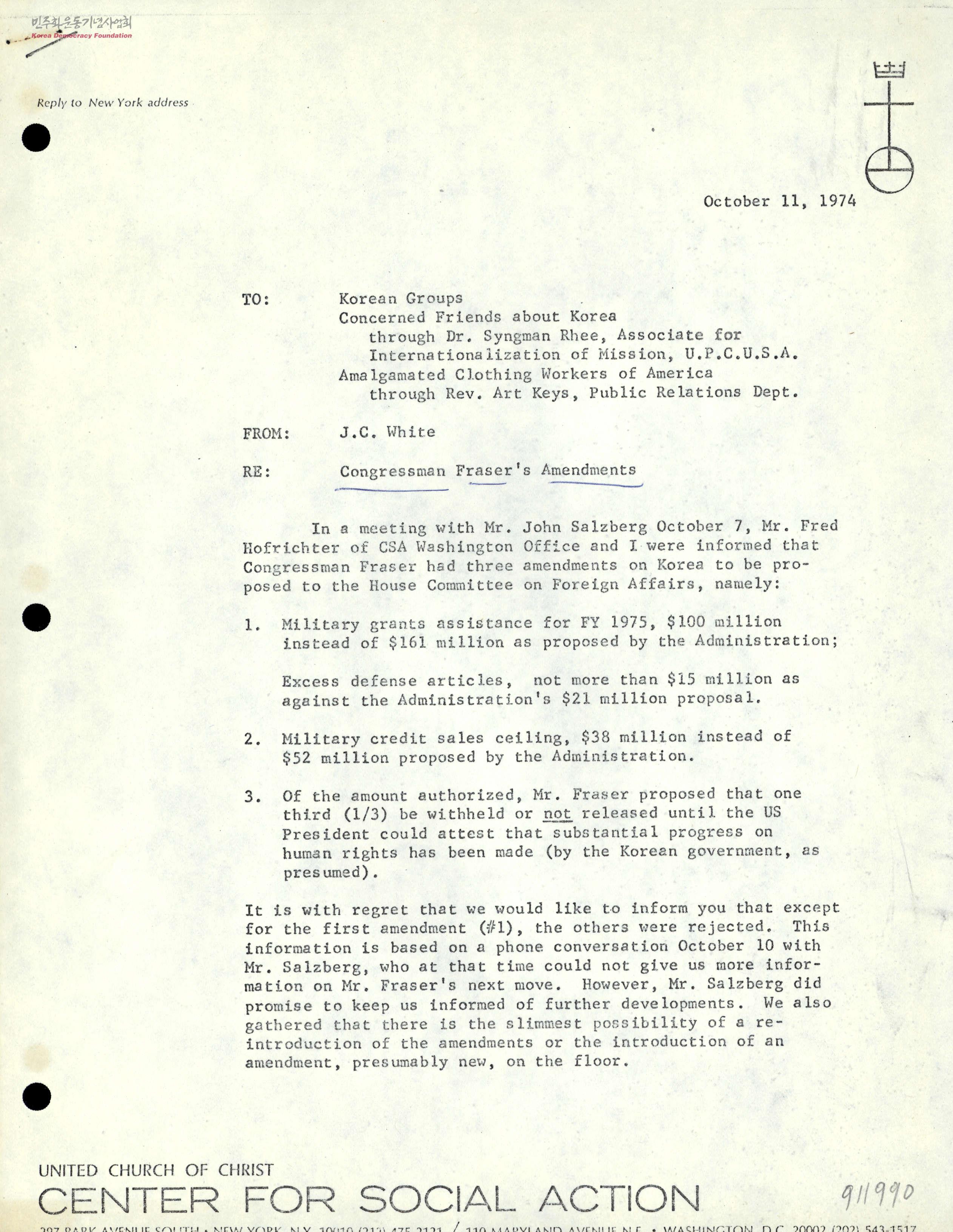 - 박정희 독재정권의 인권 유린에 제동을 걸기 위한 프레이저 개정안에 대해 재미 한인들에게 설명한 글