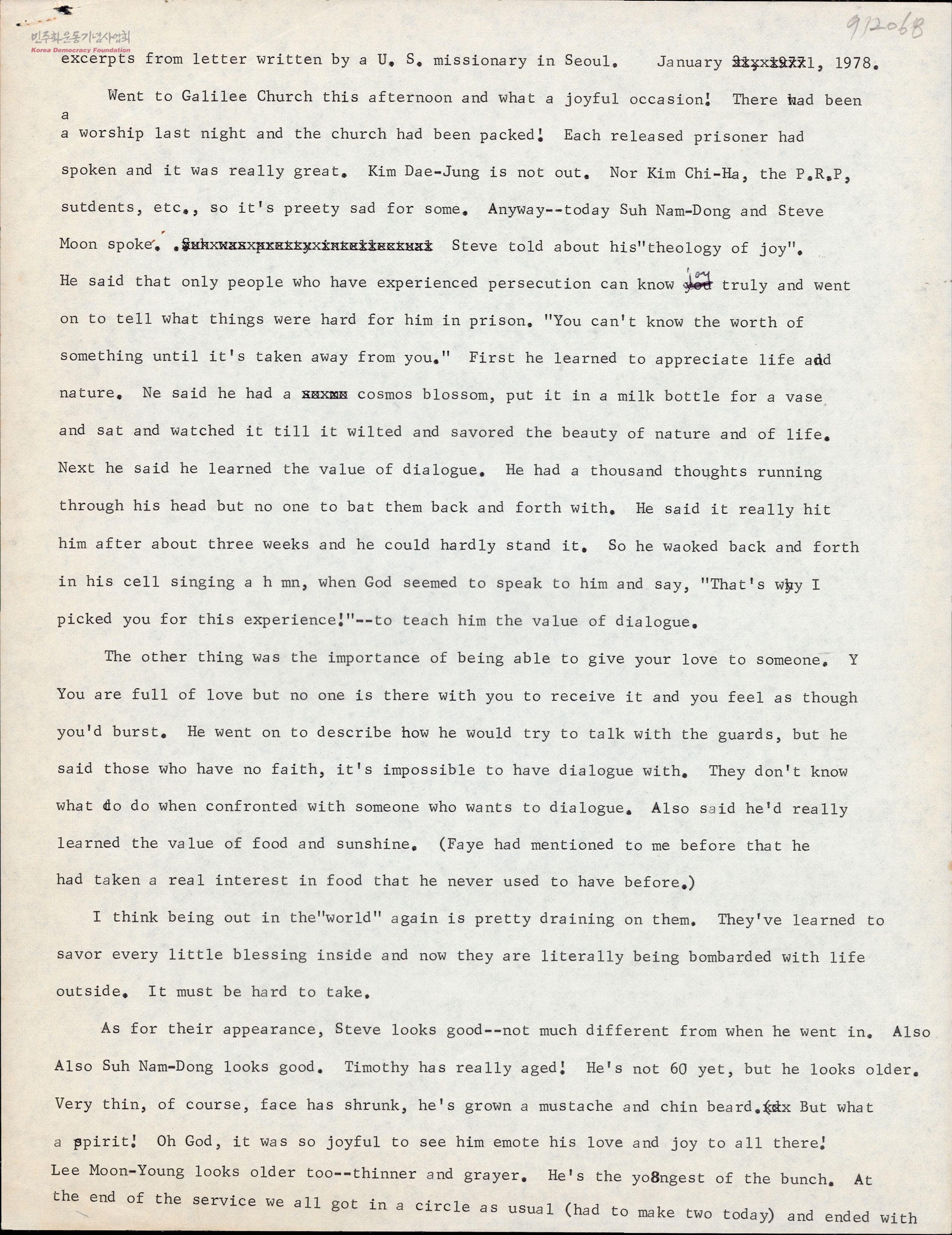 - 3.1 민주구국선언 사건으로 구속된 인사들의 소식과 1978년 석방된 문익환, 박형규, 서남동 등 민주인사들 및 그 가족과의 만남을 묘사한 선교사의 글.