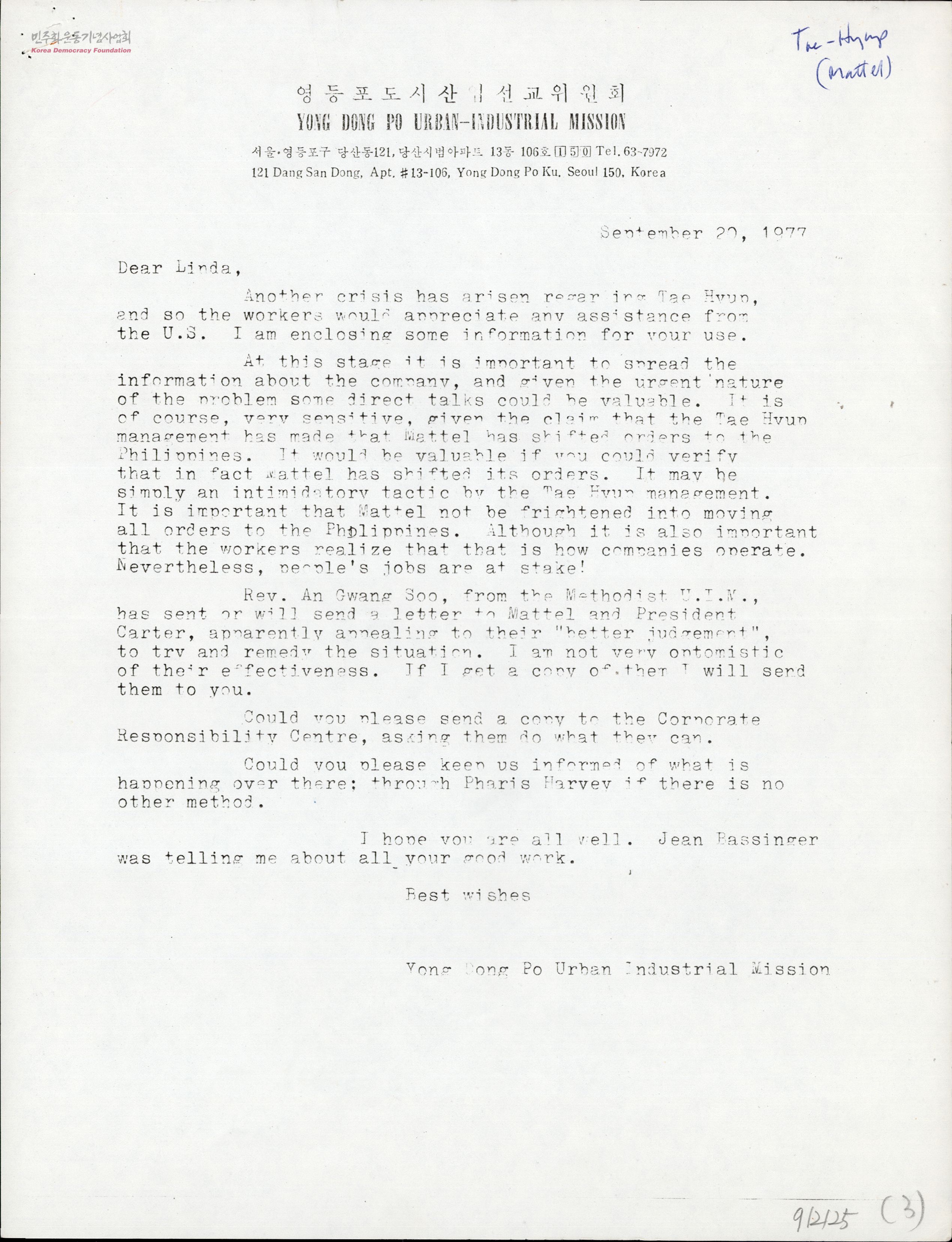 영등포 도시산업선교위원회가 Linda Jones에게 보낸 설명문