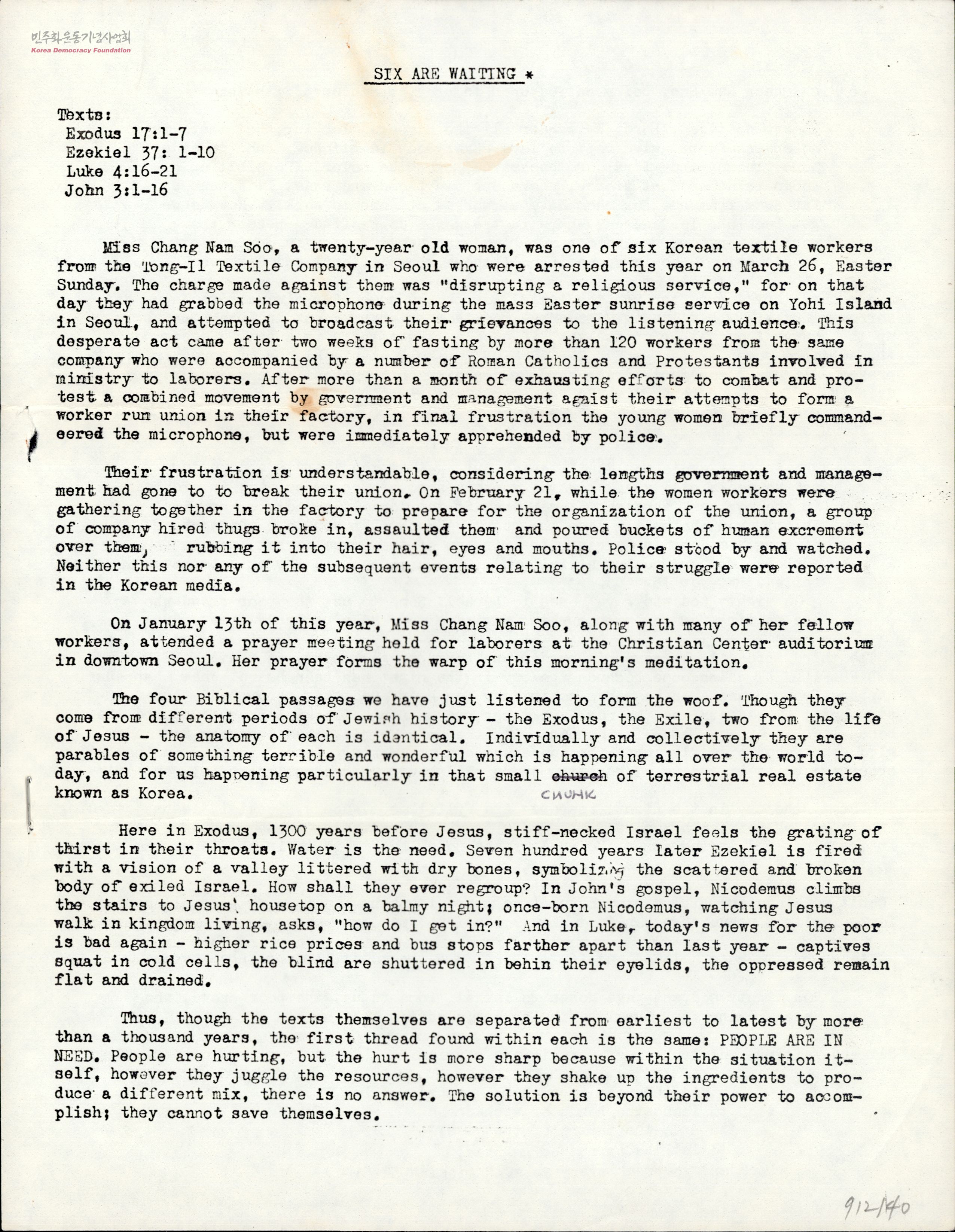 - 70년대 말 한국 섬유공장 여공들의 노동현장의 열악함을 알리는 78년 예배문