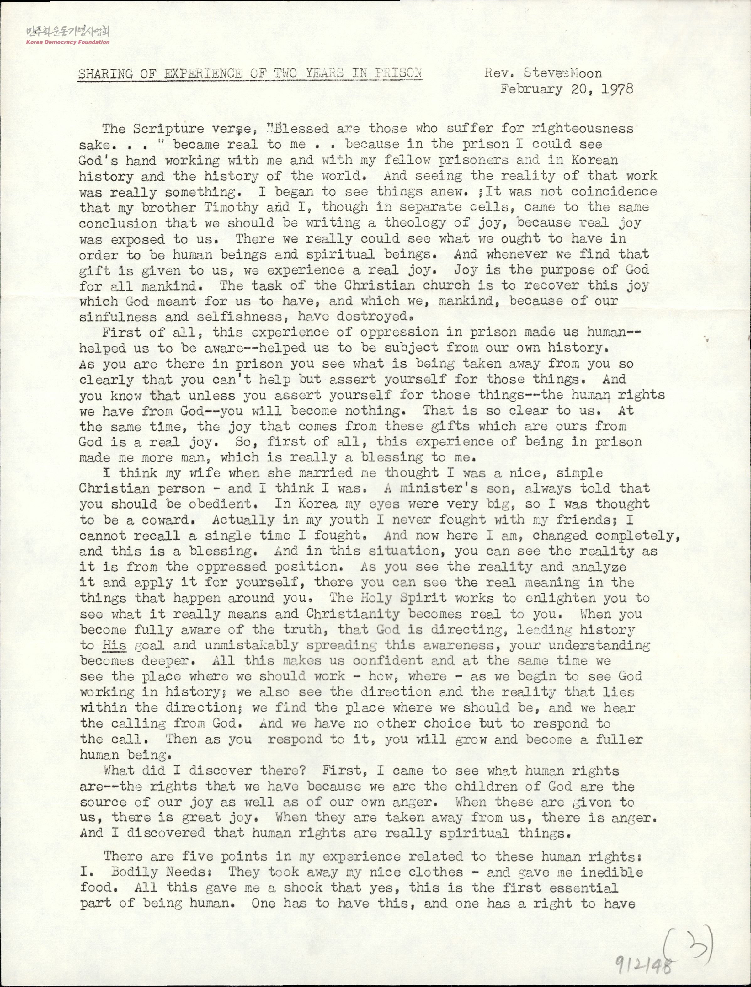 - 78년, 2년만에 출소한 문동환 목사의 옥중 체험과 석방소감 및 인권의 중요성 강조 - 부인 Faye Moon(문혜림)이 린다 존스에게 쓴 서신