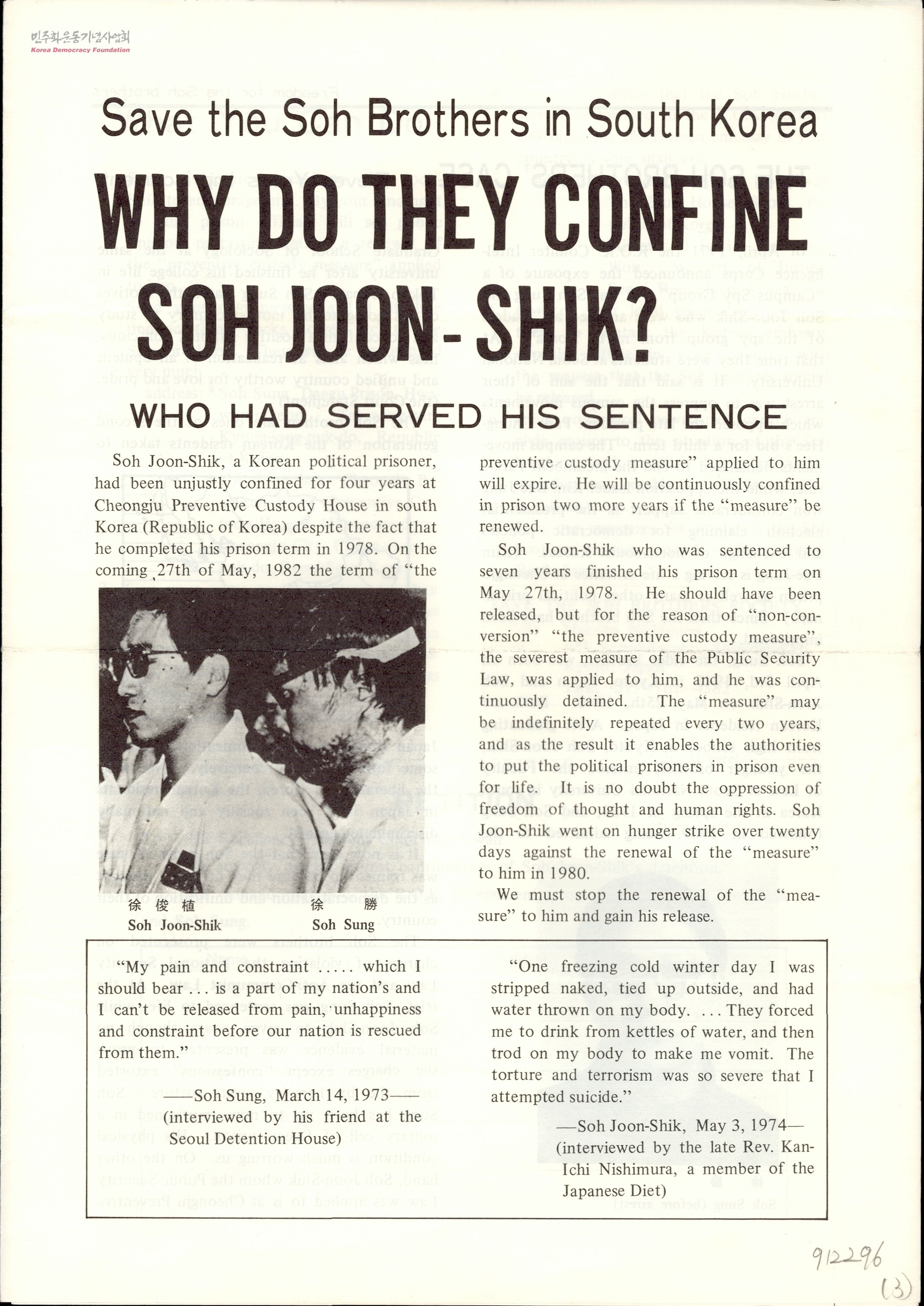 - 1971년 '재일교포 유학생 형제 간첩 사건'으로 사형선고를 받은 뒤 무기수로 수감중인 서승과 7년의 확정된 형기를 마치고도 사회안전법의 보안감호 처분으로 인해 비전향장기수로 계속 수감 중인 서준식 형제의 구명운동 관련자료