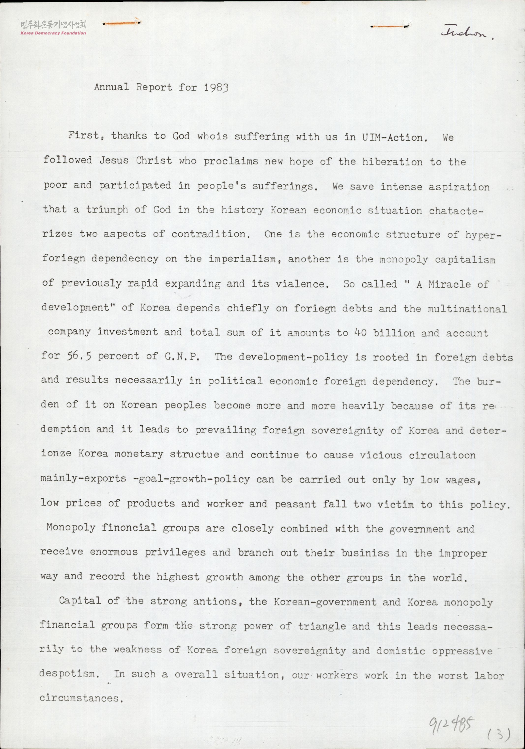 - 수출주도성장정책으로 노동자와 농민이 희생되는 현실에서 도시산업선교회의 사명을 설명하고, 인천 도산일꾼교회를 중심으로 연간 활동을 정리한 보고서