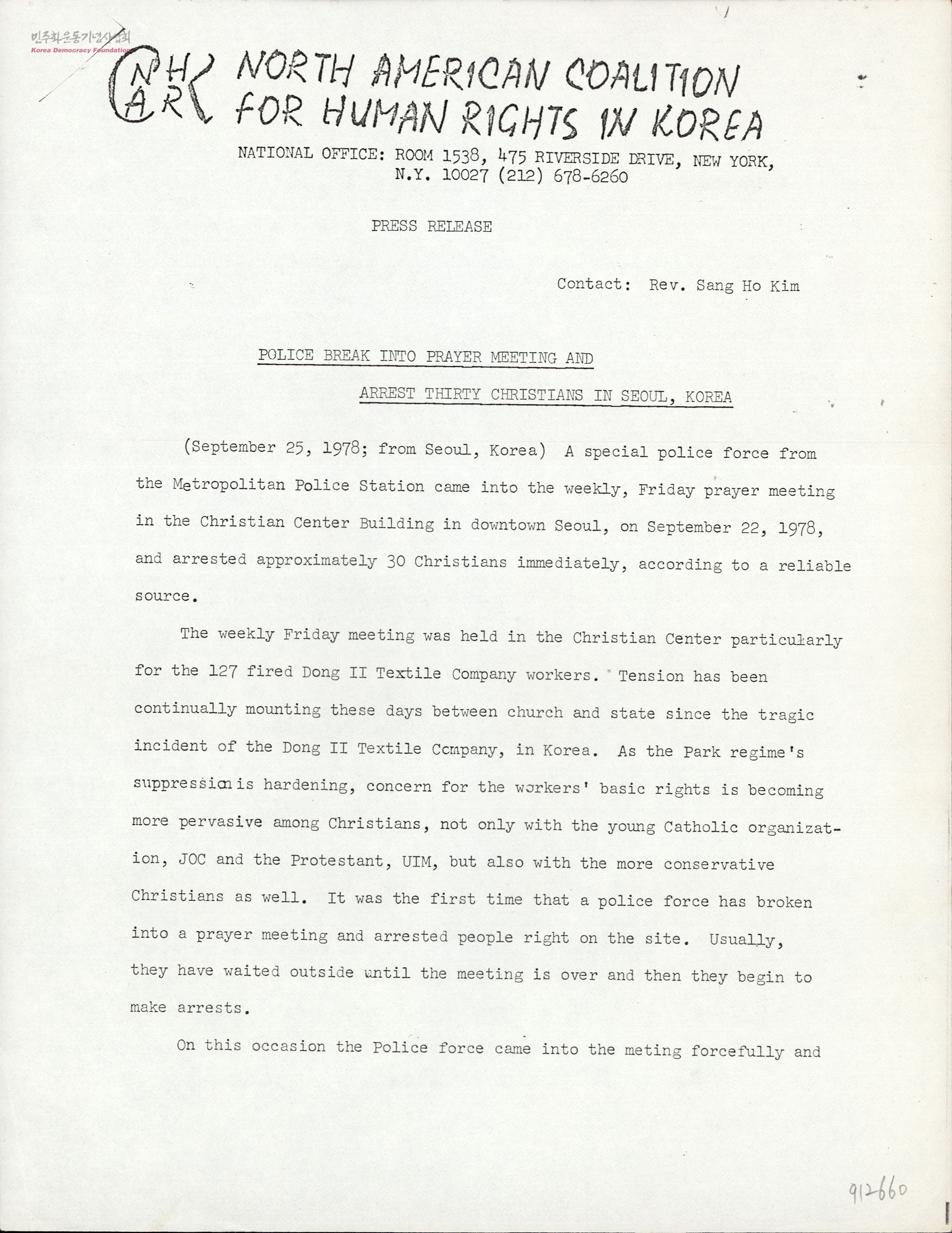 - 9월 22일 가톨릭노동청년회(JOC), 도시산업선교회(UIM) 등이 개최한 동일방직 해고 노동자를 위한 기도회에 경찰이 난입하여 조화순 목사와 참가자들을 연행하고, 배후조종 혐의로 박형규 목사를 체포한 사건의 소식을 알리고 이에 대한 추가 정보를 미 국무부와 주한미대사관 측에 요청하는 NACHRK의 보도자료.