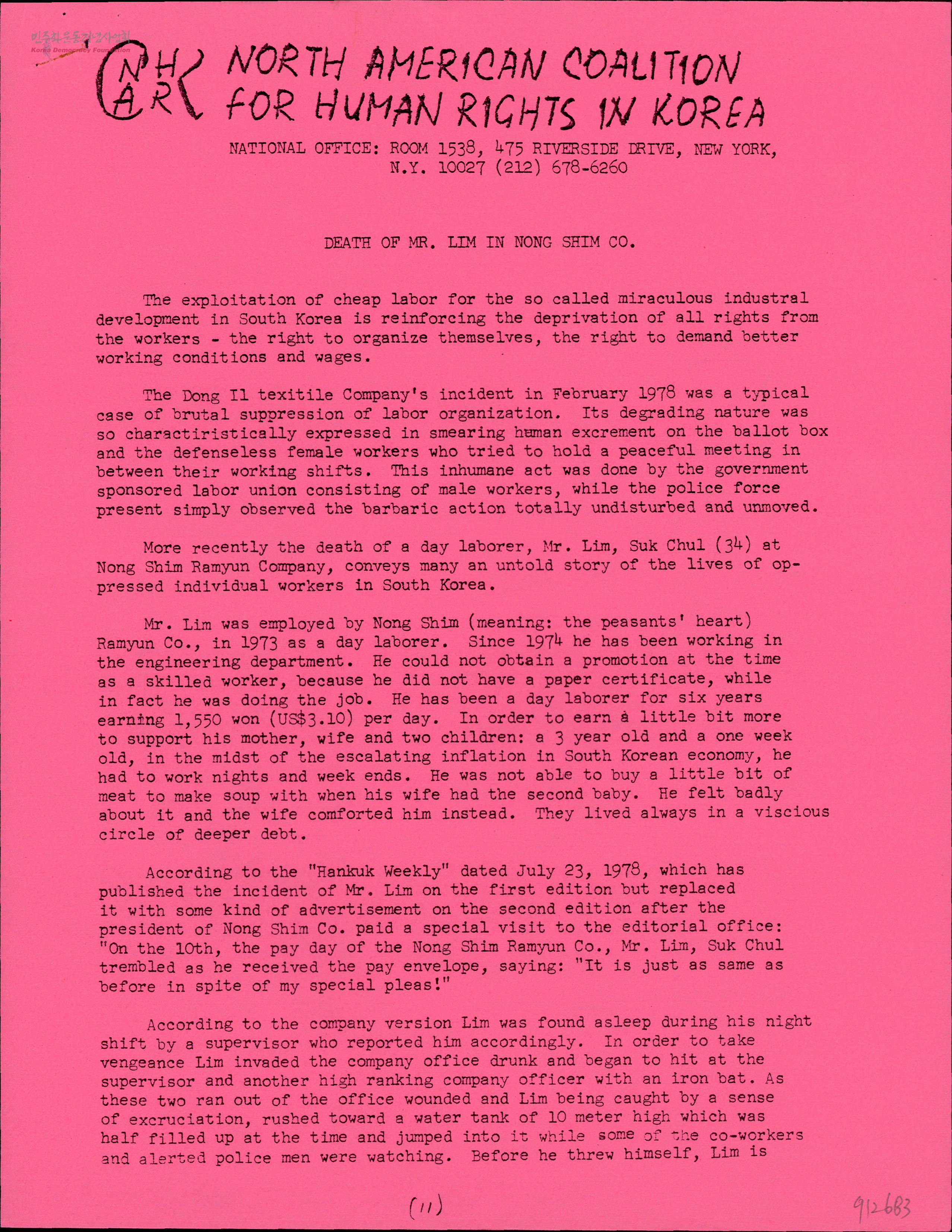 - 동일방직 여성노동자와 1978년 7월 사망한 농심라면 노동자 임석철의 예를 들며 저임금 등 한국의 열악한 노동인권 상황을 알리는 NACHRK의 소식지.