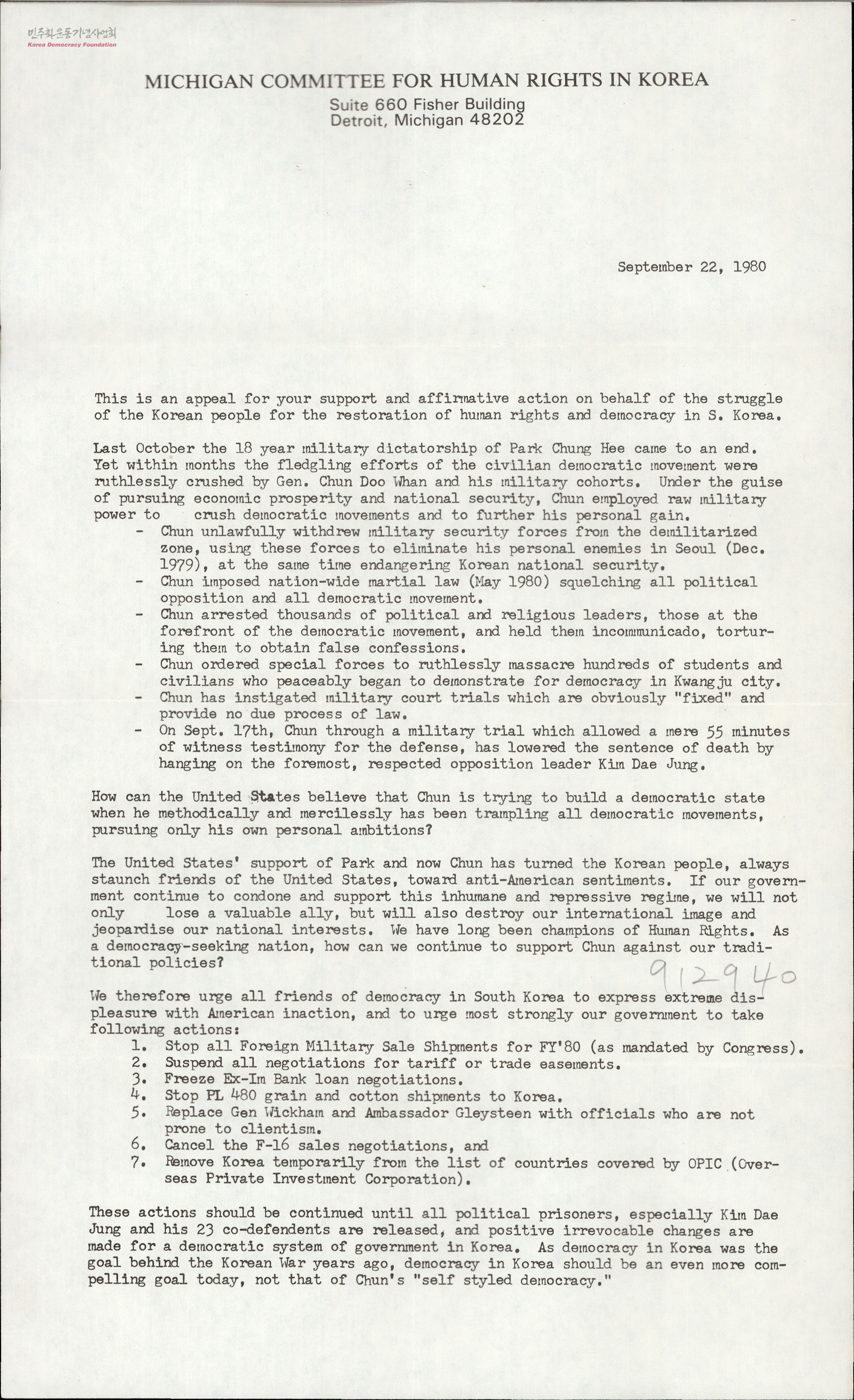 - 박정희 암살 이후 전두환의 권력 장악과 민주화인사 탄압, 광주 학살, 김대중 사형선고 등에 대한 압박으로 미국 정부가 한국에 군사 및 경제 지원을 끊으라는 내용 - 김대중 사형선고에 무관심한 미국 정부를 규탄하는 내용으로 지미카터에게 보낸 전문 수록 - 김대중 사형 선고 규탄 기사스크랩 - 린다 존스에게 S.K.가 보낸 편지