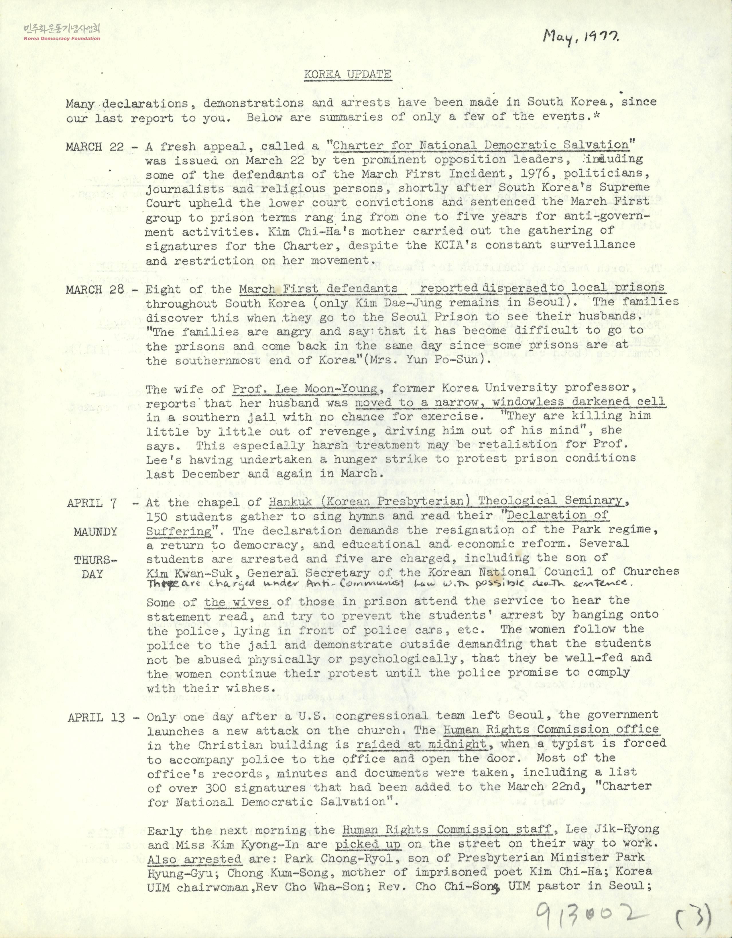 - 197년 3월 22일부터 4월 13일까지 '민주구국헌장' 발표, 3.1민주구국선언 관련자 이감, 한신대 '고난선언' 사건, 기독교회관 인권위원회 급습과 관계자 연행, 한국의 인권을 위한 북미연합(NACHRK)의 서명운동 시작 등 한국 민주화운동 관련 소식