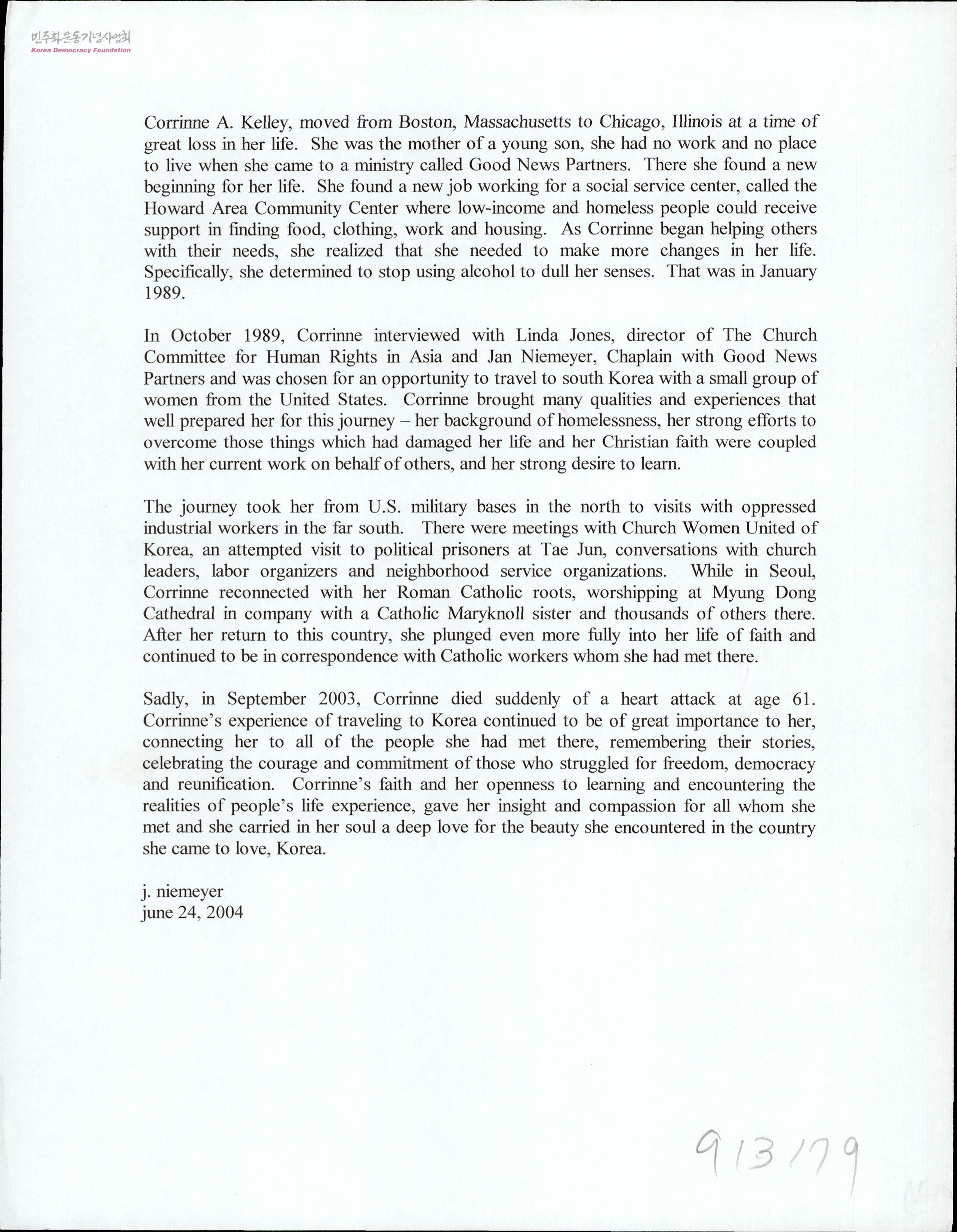 - 1989년 CCHRA 주관 '여성들의 한국탐방' 행사 참여 회원 Corrinne A. Kelly의 '기행 일기' (수기 원문 복사본과 타이핑 제본)