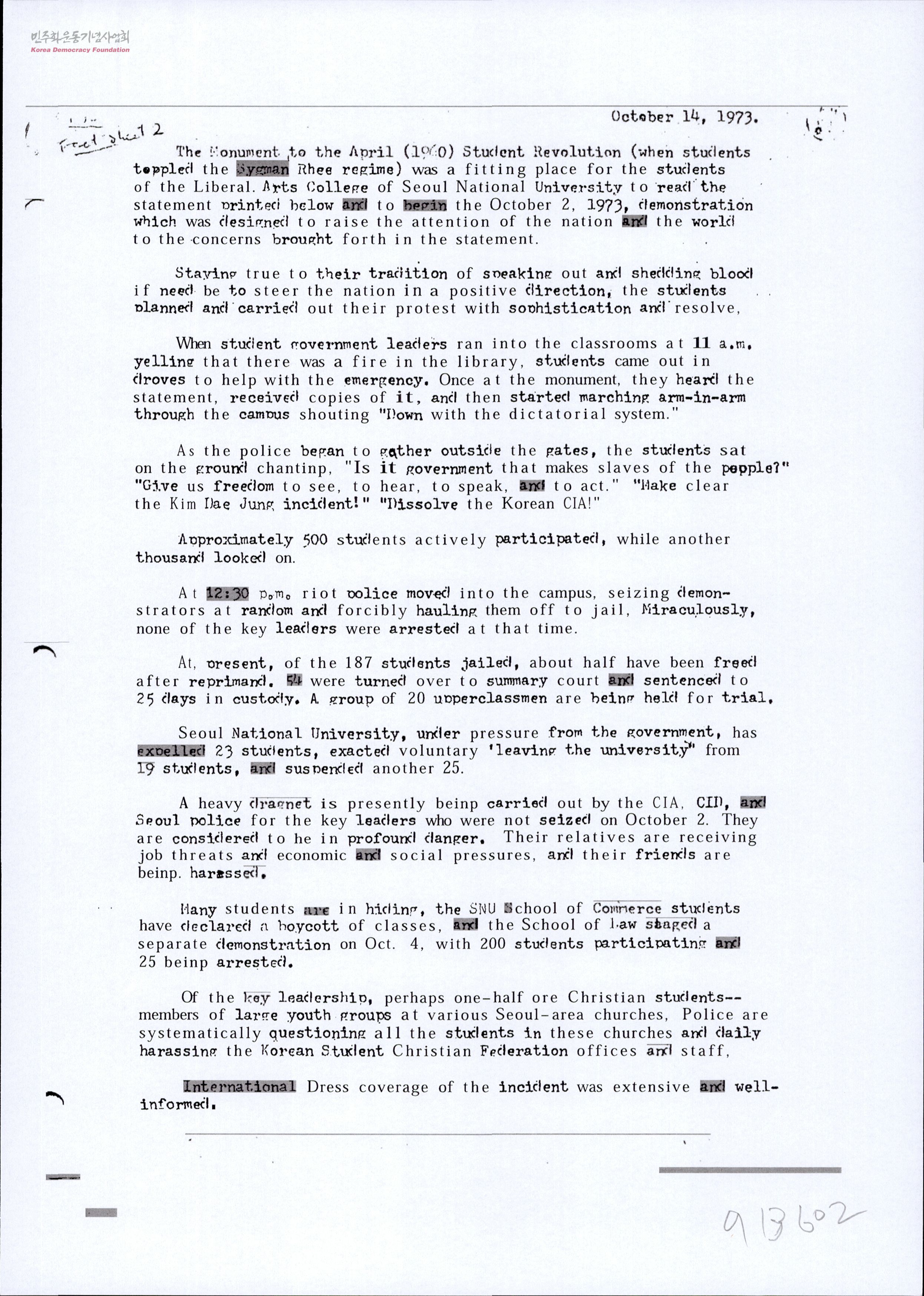 Fact Sheet #2. [73. 10. 2 서울대 문리대 학생 시위]