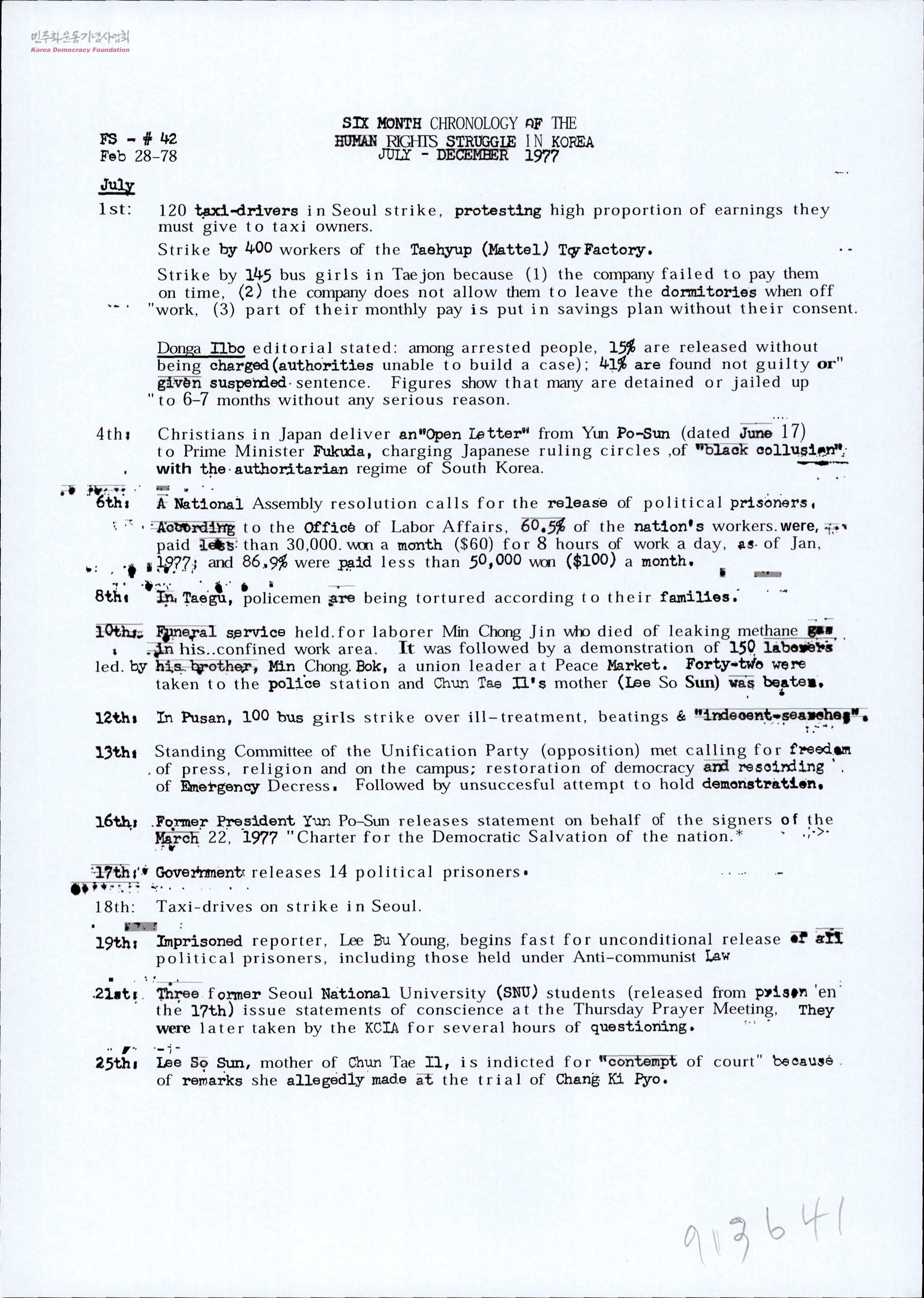 Fact Sheet #42 Six Month chronology of the Human Rights Struggle in Korea July-December 1977