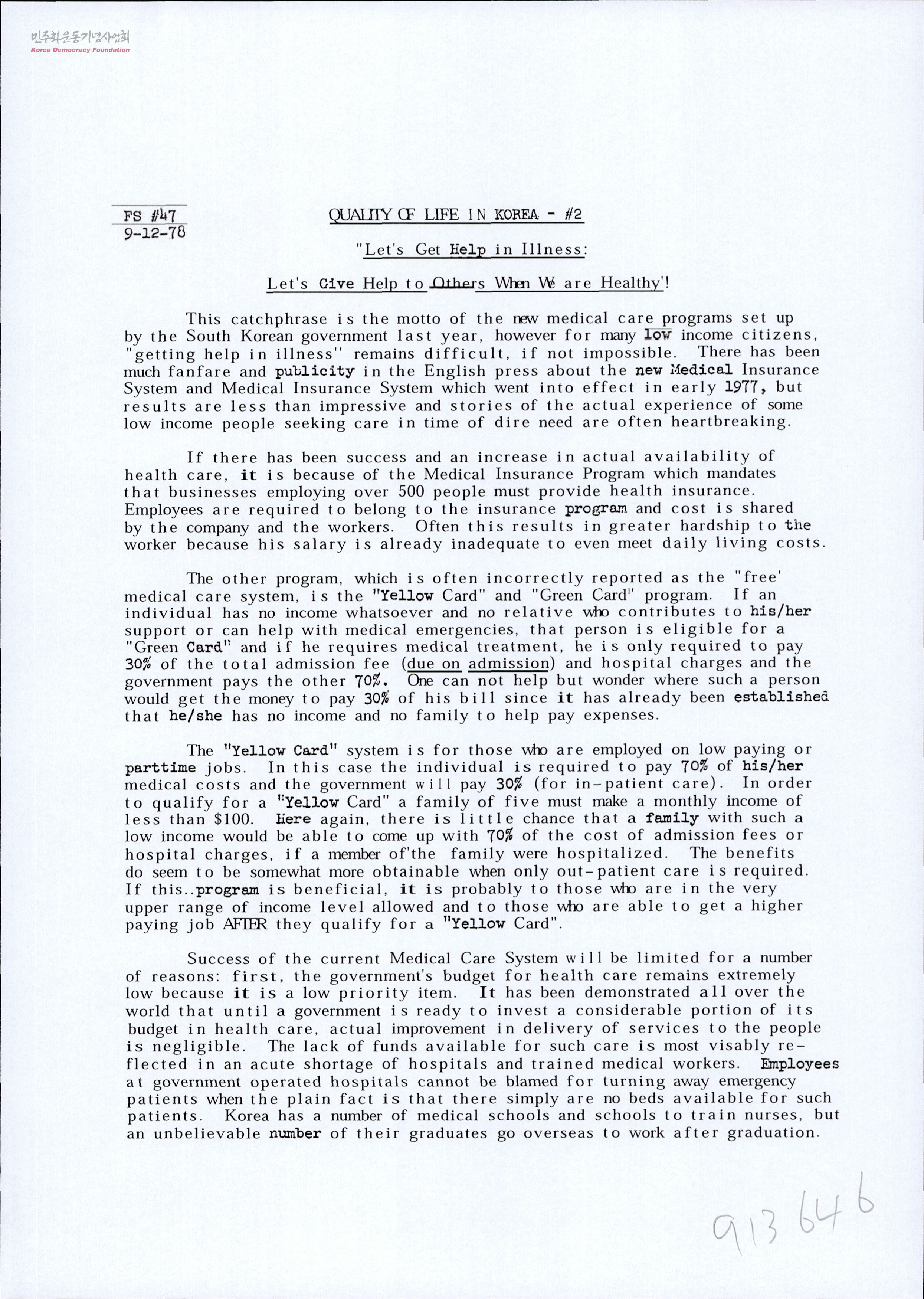 Fact Sheet #47 Quality of Life in Korea - #2: "Let's Get Help in Illness: Let's Give Help to Others When We are Healthy"