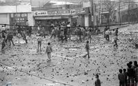 춘천 육림극장 앞 길에서 깃발을 든 채 도로 점거를 시도하는 통일선봉대