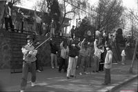 학생들을 가로막는 경찰에 항의하기 위해 보도블록을 깨고 있는 춘대협 학생들