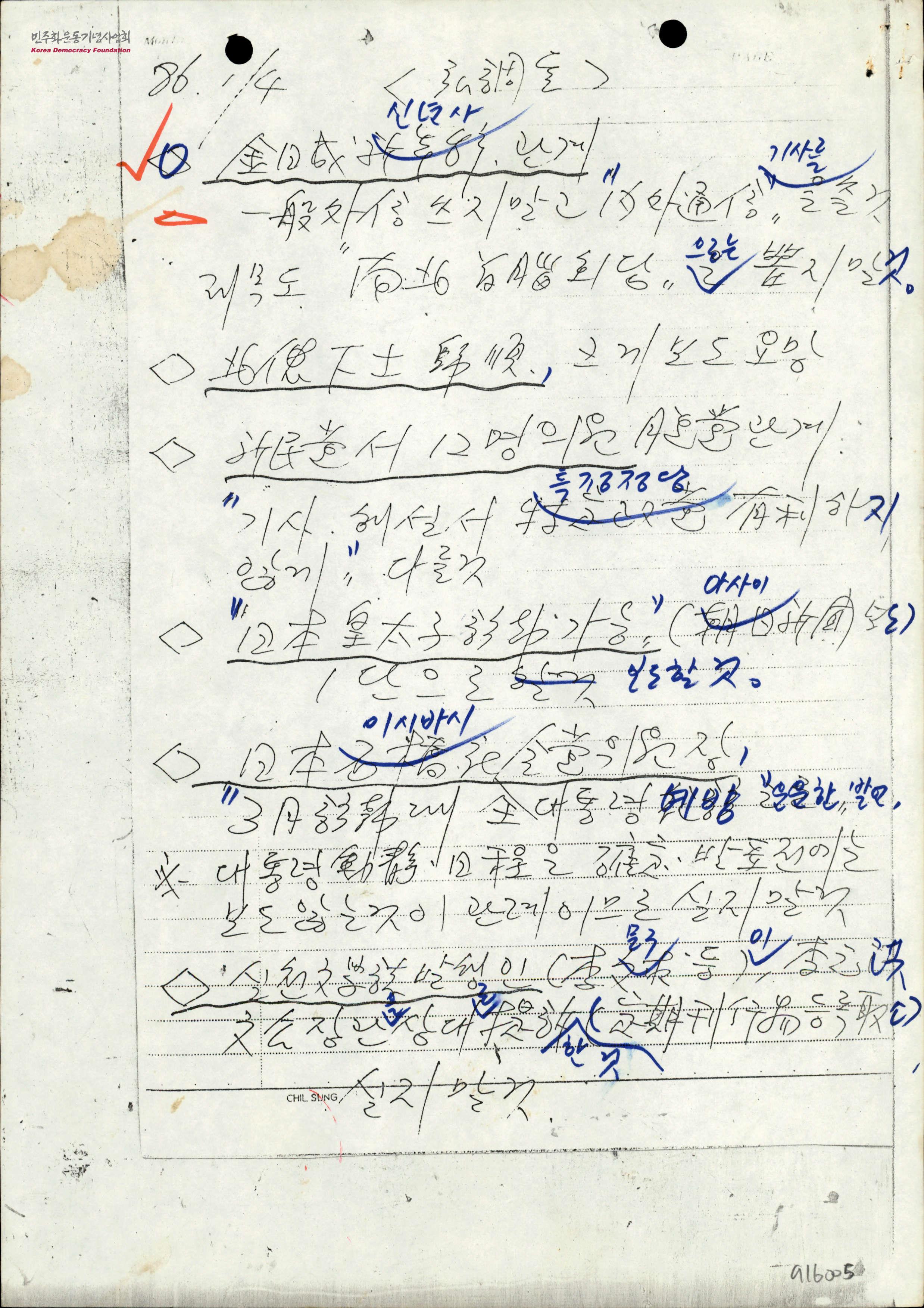 - 김일성 신년사, 북괴군 하사 귀순, 신민당 12명 의원 탈당, 일본 황태자 방한가능, 일본사회당 이시바시 위원장의 3월 방한 때 전대통령 예방, 실천문학사 발행인이 이원홍 문공부장관 상대 제소건 보도와 관한 보도지침
