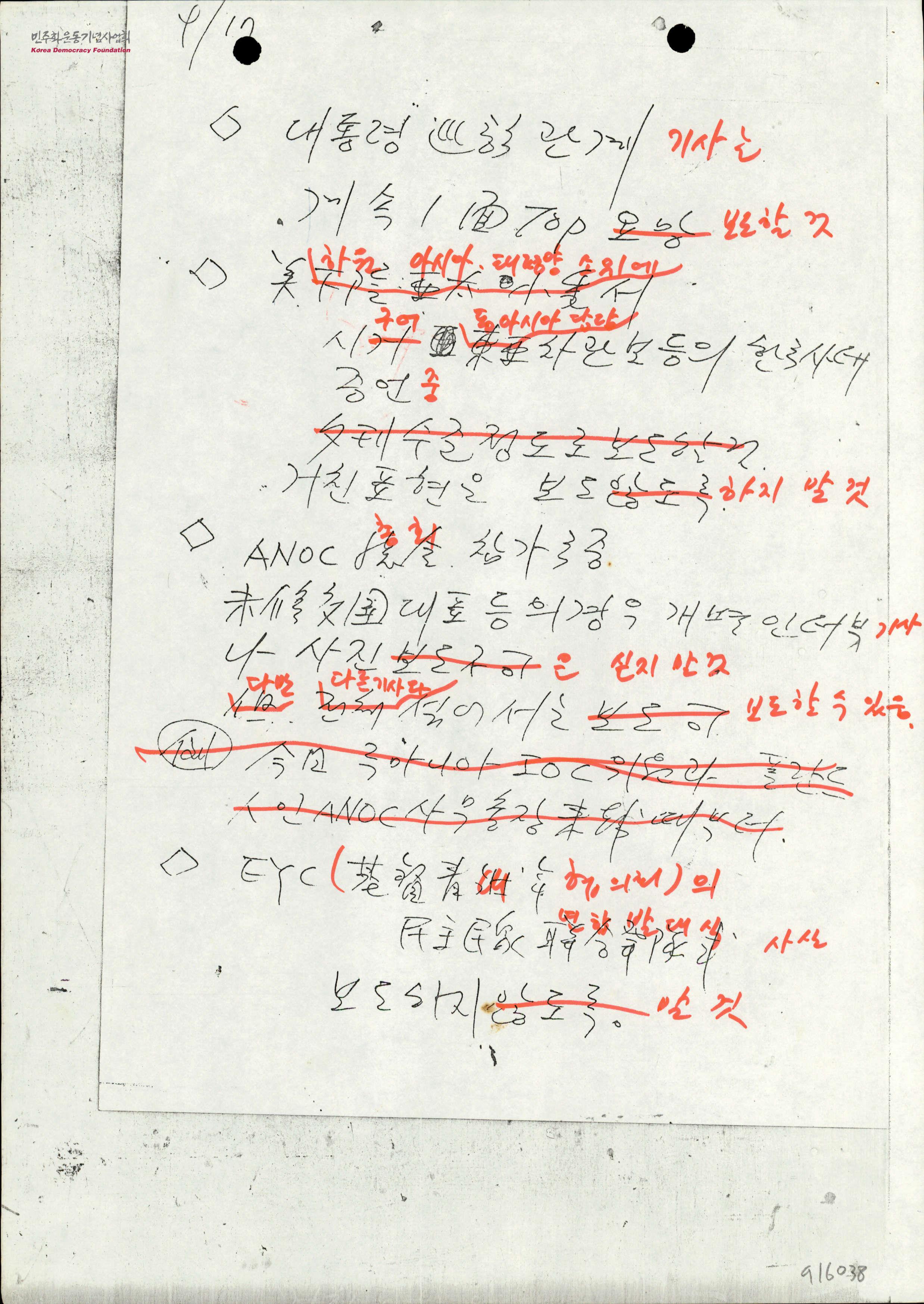 - 대통령순방 관계기사는 계속 톱 기사처리, 미국하원 아시아 태평양 소위원회에서 시구어 국무성 동아시아담당 차관보가 행한 한국 사태 증언내용 중 거친 표현 보도자제, 아노크총회 참가국 중 미수교국 대표등의 경우, 개별 인터뷰 사진은 싣지 말 것 지시, 기독교청년협의회의 민주민중발대식 사실의 보도금지가 담긴 보도지침