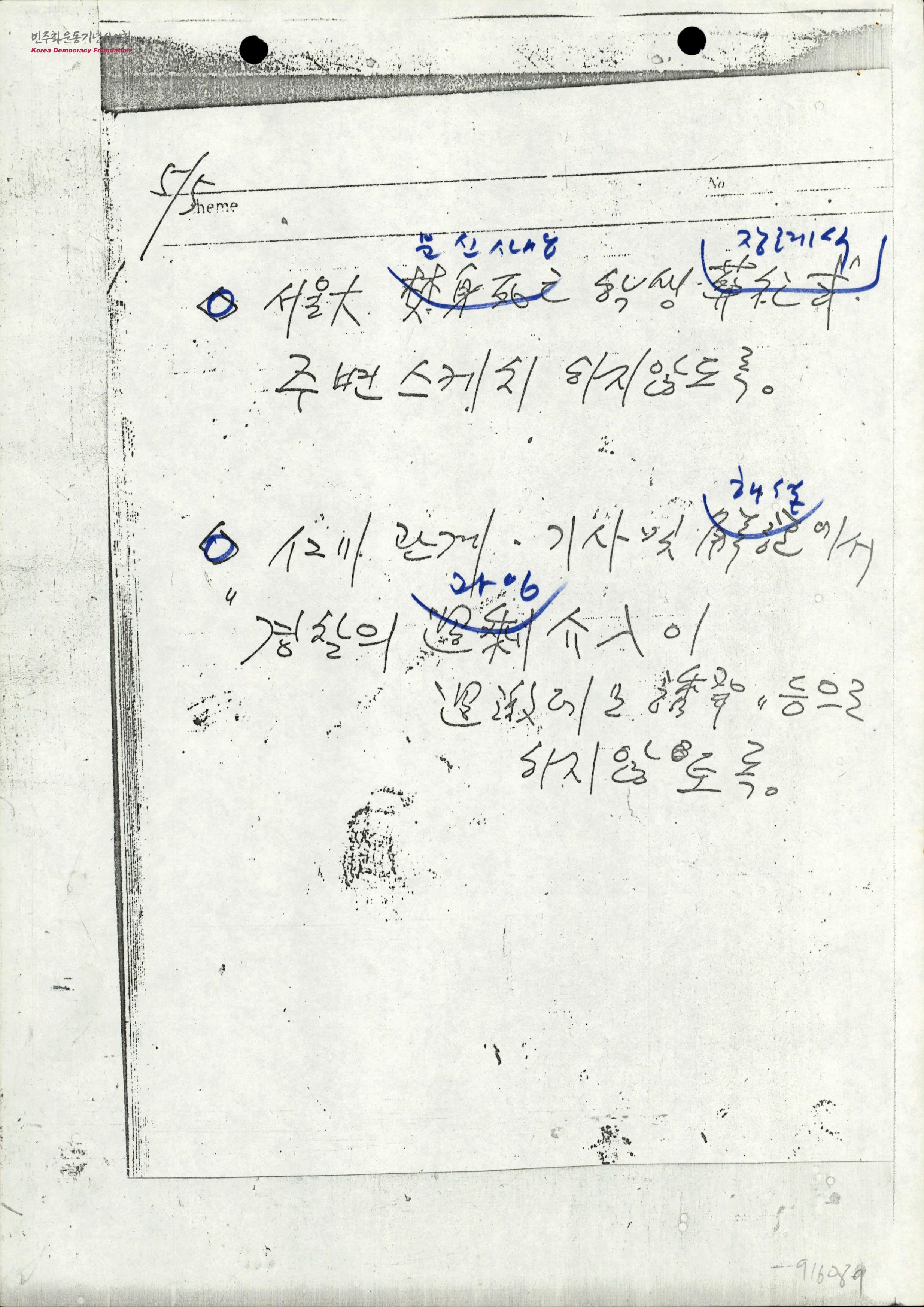 - 서울대 분신사망학생의 장례식 주변 정황 스케치 기사 금지 및 인천시위관계기사 및 해설에서 『경찰의 과잉 개입이 과격데모를 유발』했다는 식의 기사 금지를 지시하는 보도지침