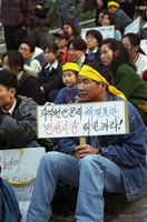 - 대학생 5,000여 명이 서울 홍제동 지하철역 앞 도로에서 우리의 소원은 통일 노래를 부르며 연와시위를 벌이고 있다.
