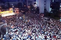 - 서울대 재학 중이던 조성만 학생의 장례식이 1만 여명의 시민, 학생이 참여한 가운데 거행되고 있다.