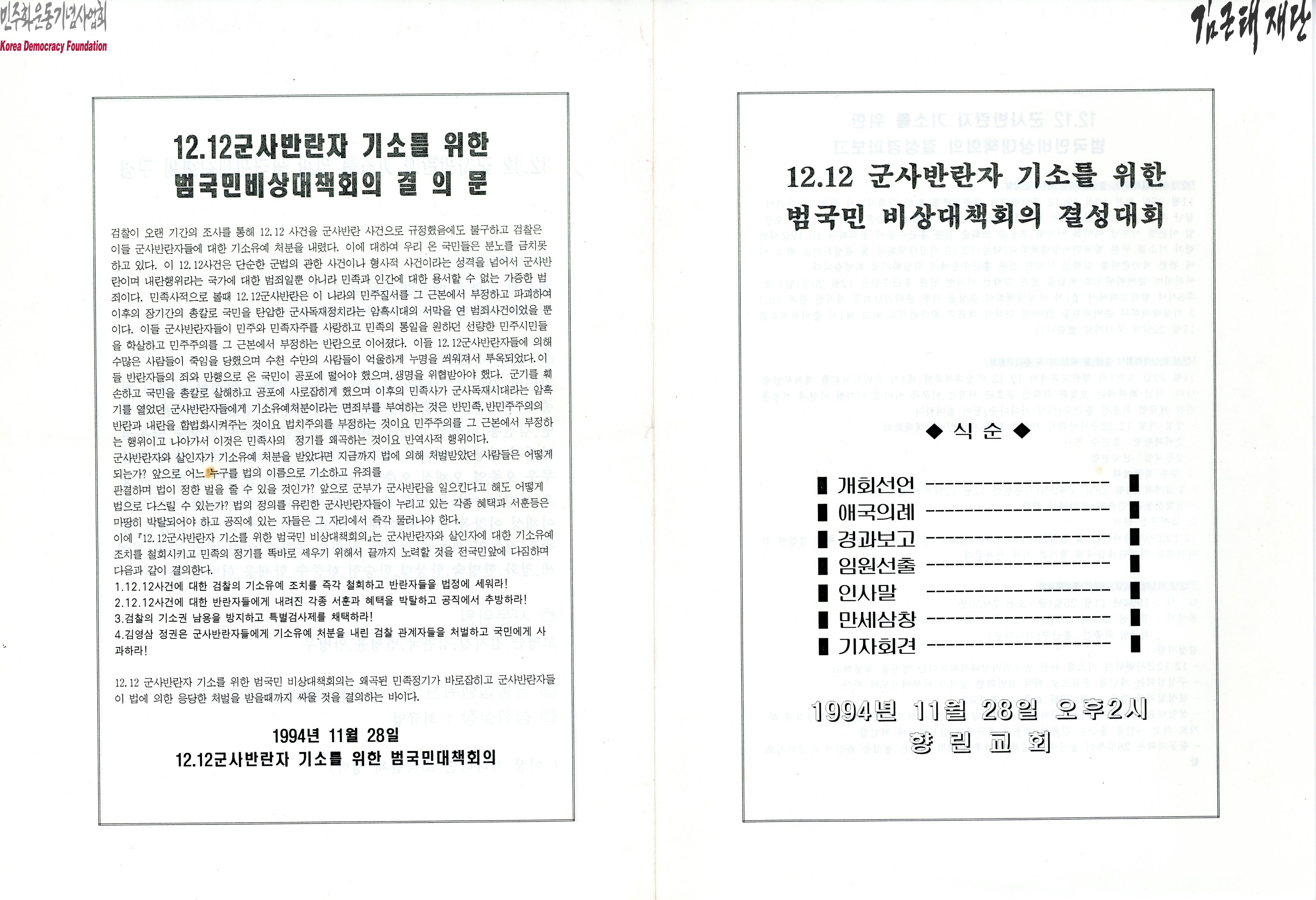 - 1994년 11월 28일에 향린교회에서 열린 12.12 군사반란자 기소를 위한 범국민 비상대책회의 결성대회에 사용한 리플릿으로 식순, 12.12 군사반란자 기소를 위한 범국민비상대책회의 결성경과보고, 12.12 군사반란자 기소를 위한 범국민대책회의 구성, 12.12군사반라자 기소를 위한 범국민비상대책회의 결의문이 담겨 있음