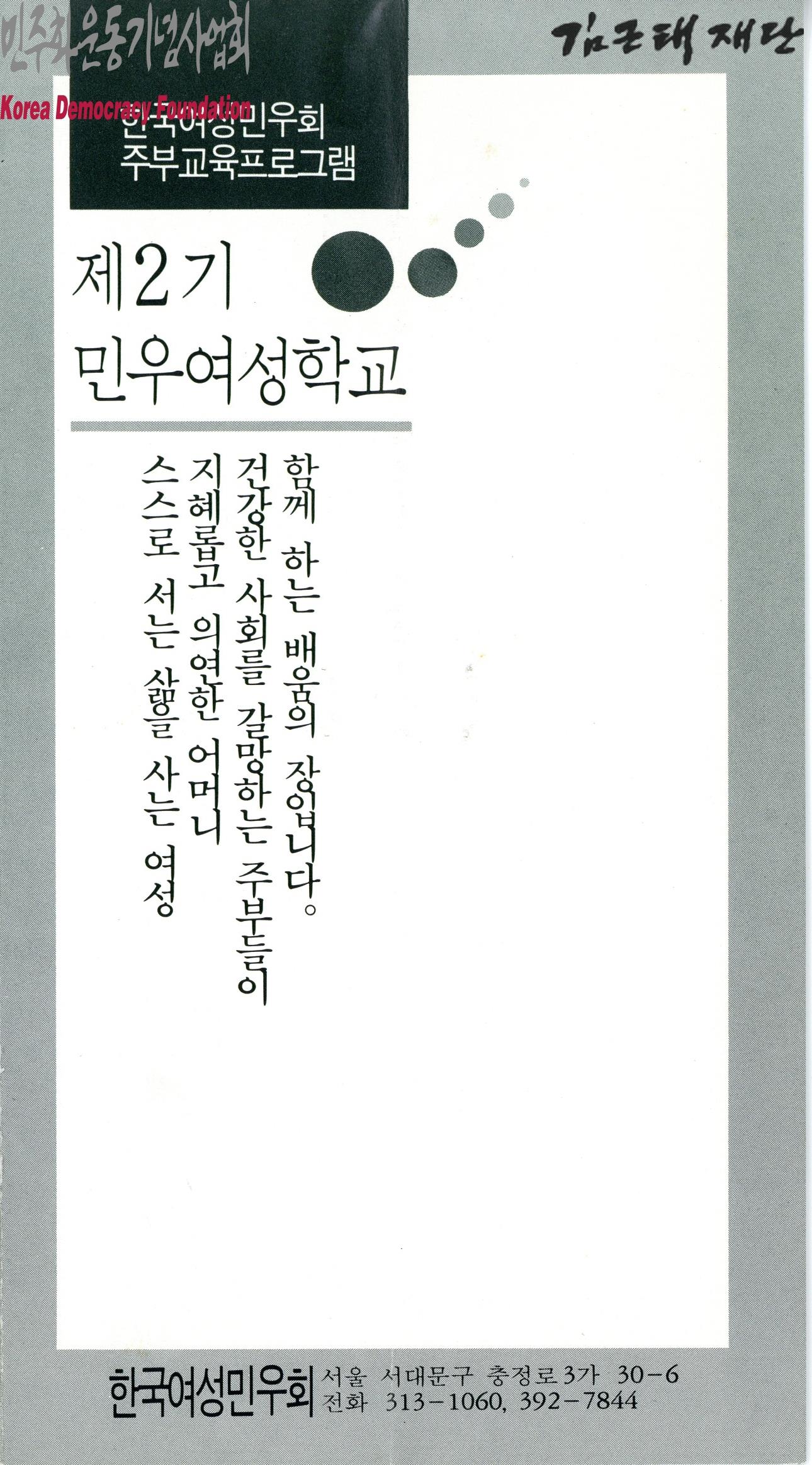 - 한국여성민우회에서 발행한 리플릿으로 제2기 민우여성학교 주부교육프로그램 참가를 독려하는 내용이 포함되어 있음