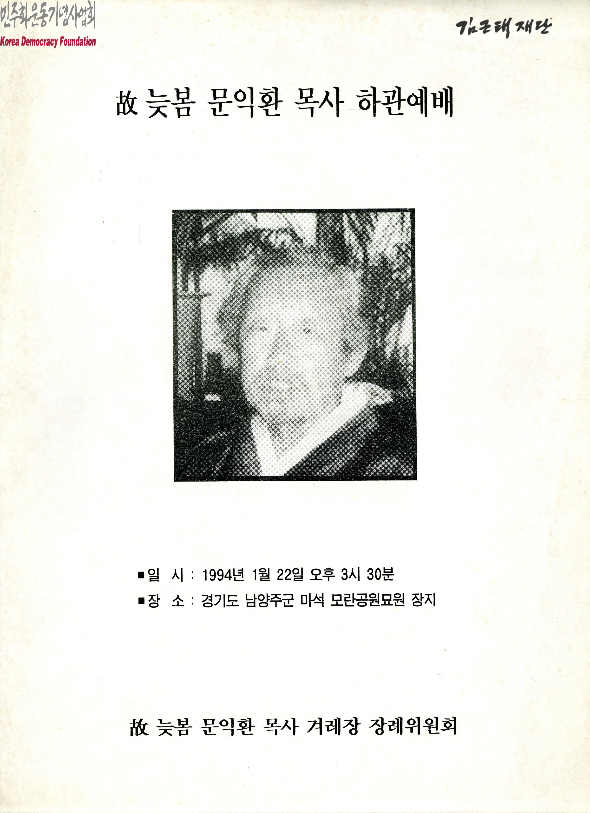 - 1994년 1월 22일 고 늦봄 문익환 목사 겨레장 장례위원회에서 발행한 팸플릿으로 예배 전 묵상, 개식사, 묵상기도, 찬송과 기도, 특송, 신앙고백 등의 순서로 하관예배가 진행될 것임을 안내하는 내용이 포함되어 있음