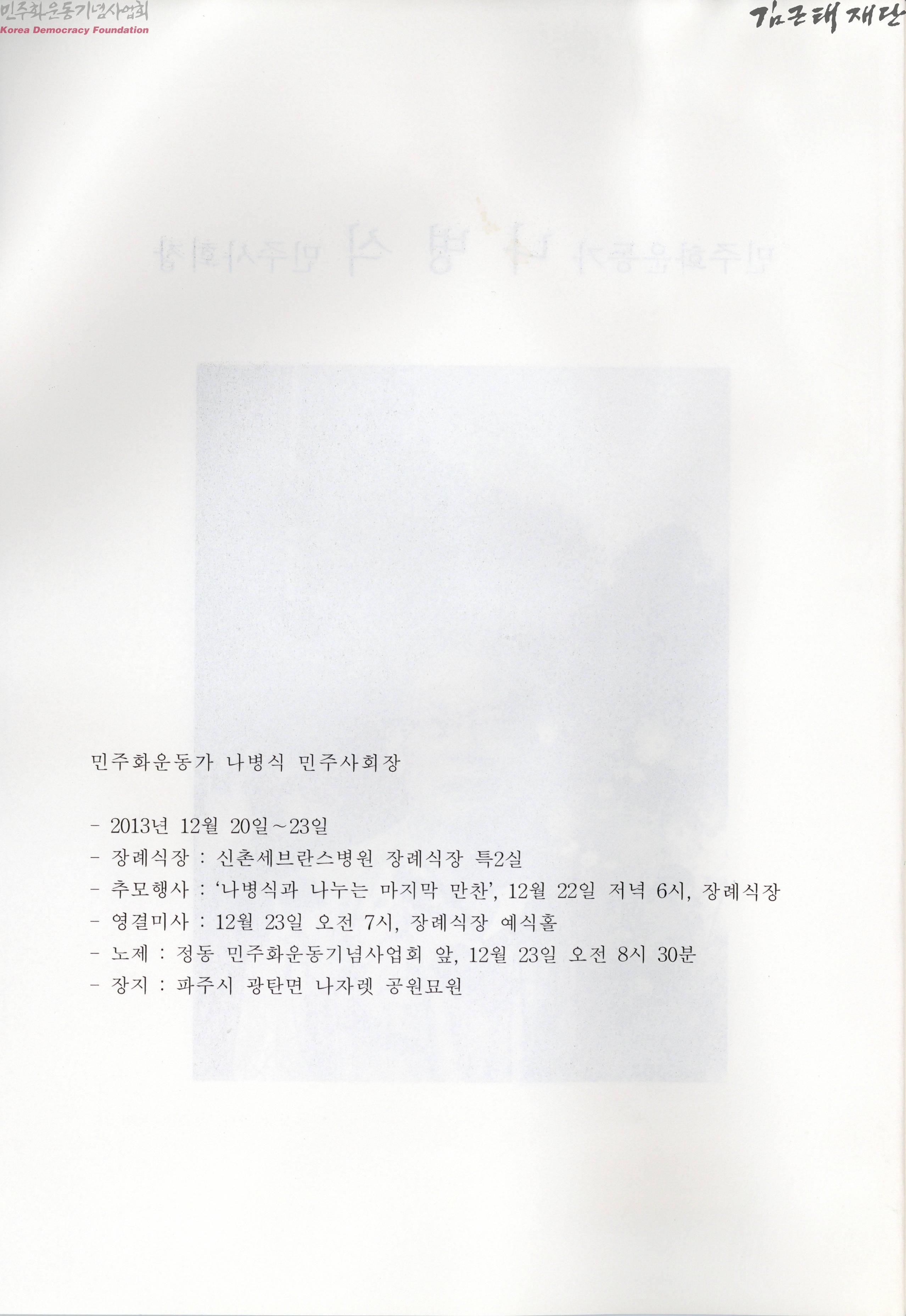 - 2013년 12월 20일부터 23일까지 있을 나병식 민주화운동가 장례식 및 추모행사에 관련하여 제작된 팸플릿으로 행사 안내와 생애, 민주화운동 발자취, 시, 추모의 글 등이 포함되어 있음