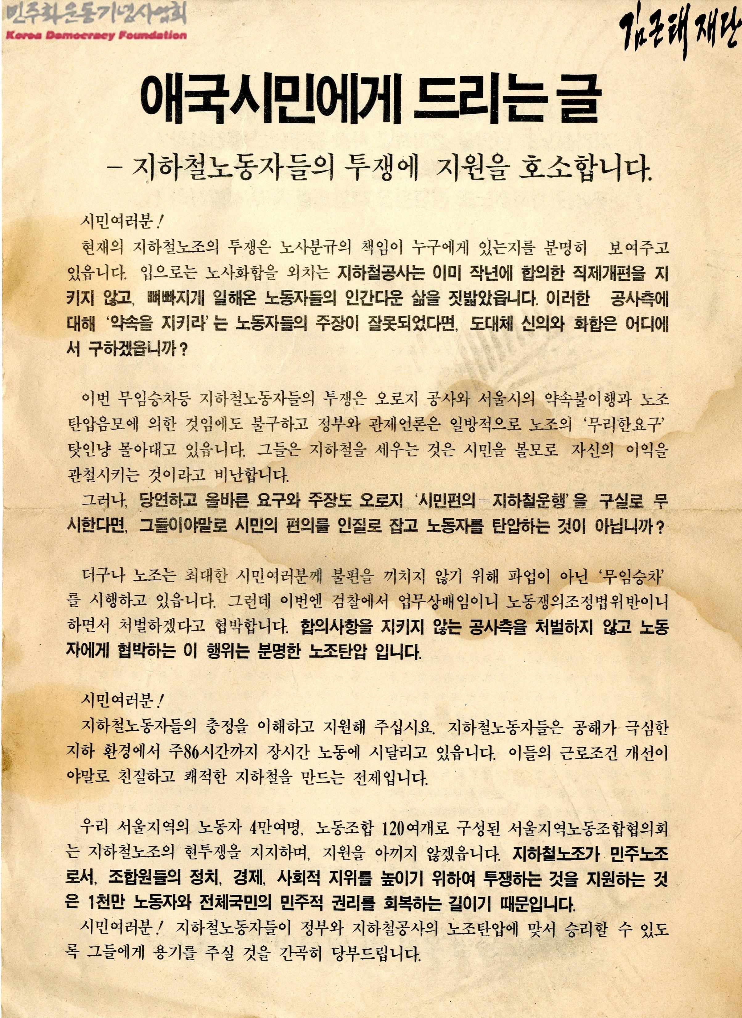 - 1989년 3월 7일 전국노동법개정및임금인상투쟁본부에서 작성한 지하철노동자들의 투쟁에 지원을 호소하는 내용이 담긴 문서로 지하철공사와 서울시의 합의각서 이행, 지하철노조 탄압 중지와 김명년 사장 퇴진, 노동자와 전국민의 집회·시위의 자유 보장, 구속된 배일도 지하철노조 전위원장 석방 등을 요구하는 내용 등이 포함되어 있음