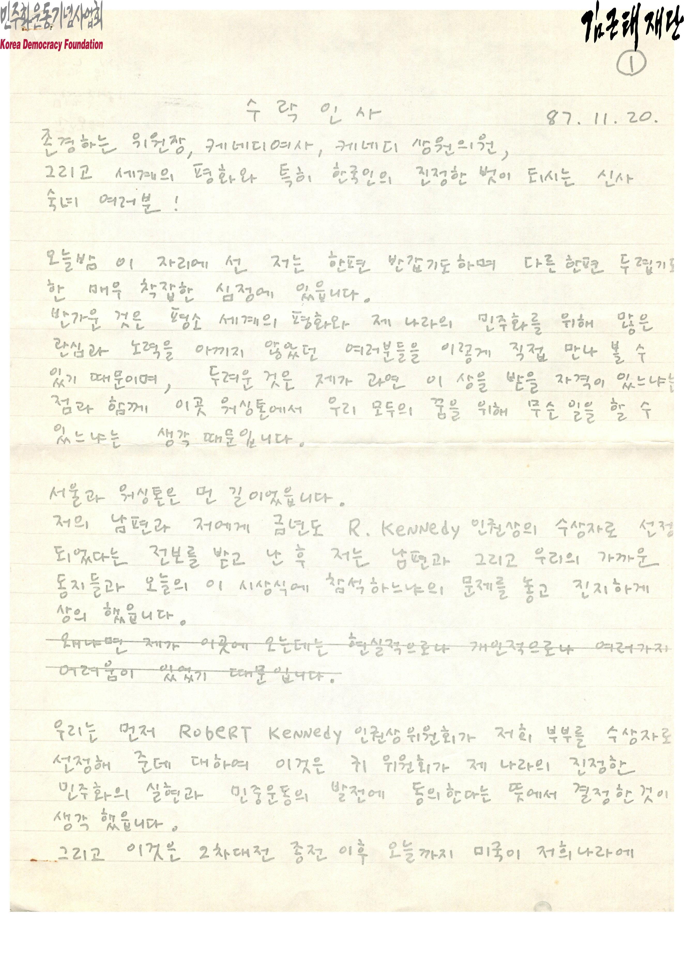 - 1987년 11월 20일에 열릴 로버트케네디인권상 시상식을 앞두고 인재근이 자필로 작성한 로버트 케네디 인권상 수상 수락인사 문서임. 로버트케네디인권상위원회가 김근태와 인재근 부부를 수상자로 선정한 것에 대한민국의 진정한 민주화의 실현과 민중운동의 발전에 동의한다는 뜻에서 결정한 것이라 생각했지만 5.18광주민주화운동 이후 대한민국 국민들 사이에 증대되고 있는 미국에 대한 강한 거부감, 6.29 민주화 선언을 했지만 아직도 민주화를 외치다 투옥된 동지들의 곁을 떠날 수 없다는 두려움 등의 이유로 미국 방문에 어려움이 있다고 밝힘