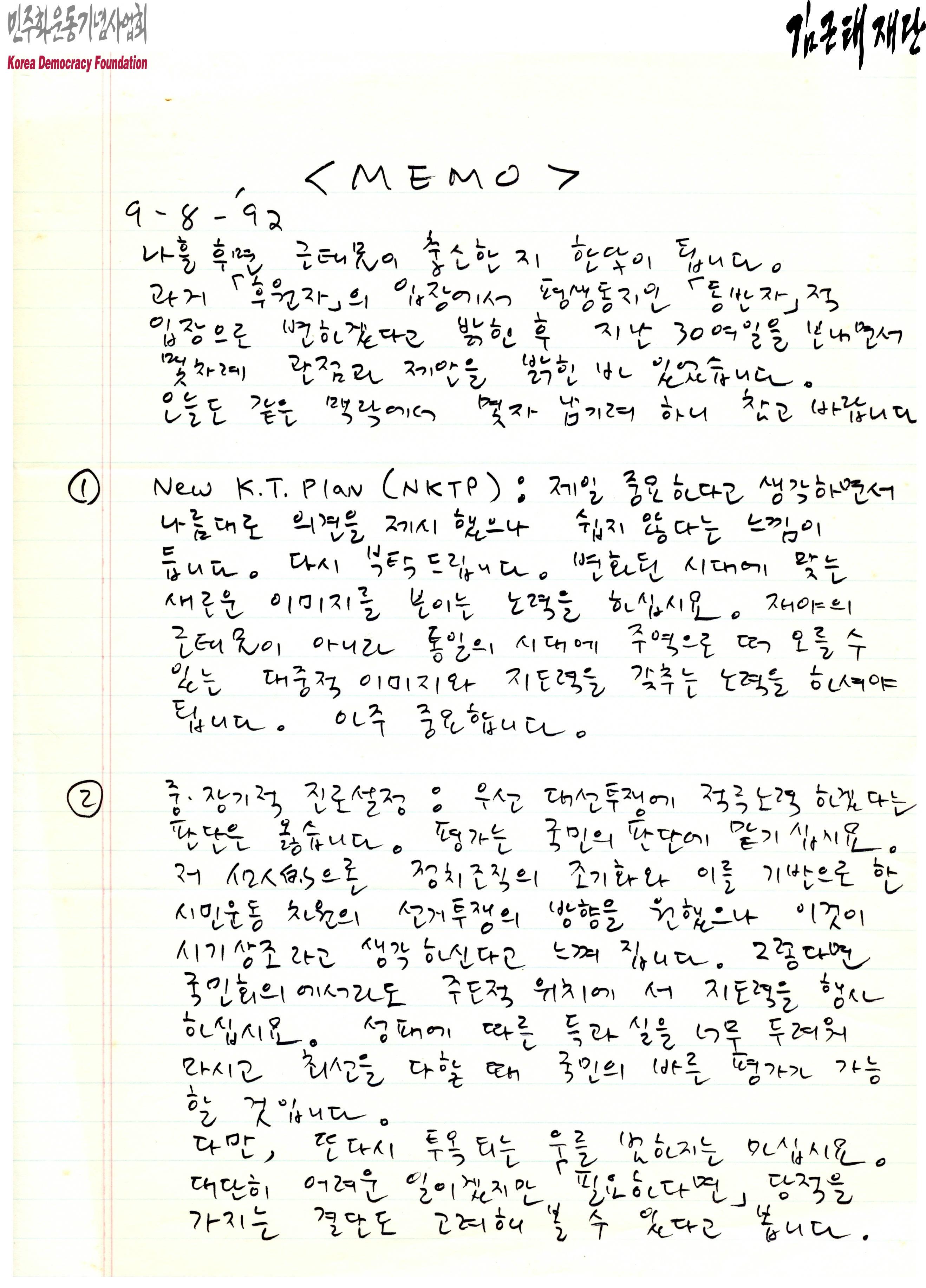 - 1992년 9월 8일 김근태 형이 출소한 후 한 달을 보내면서 몇차례 관점과 제안을 자필로 작성한 문서로 재야의 이미지가 아닌 통일의 시대에 주역으로 떠오르는 대중적 이미지와 지도력을 갖추는 노력을 해야 한다는 점, 국민회의에서라도 주도적 위치에 서서 지도력 행사를 해야 한다는 점 등을 제안하였음