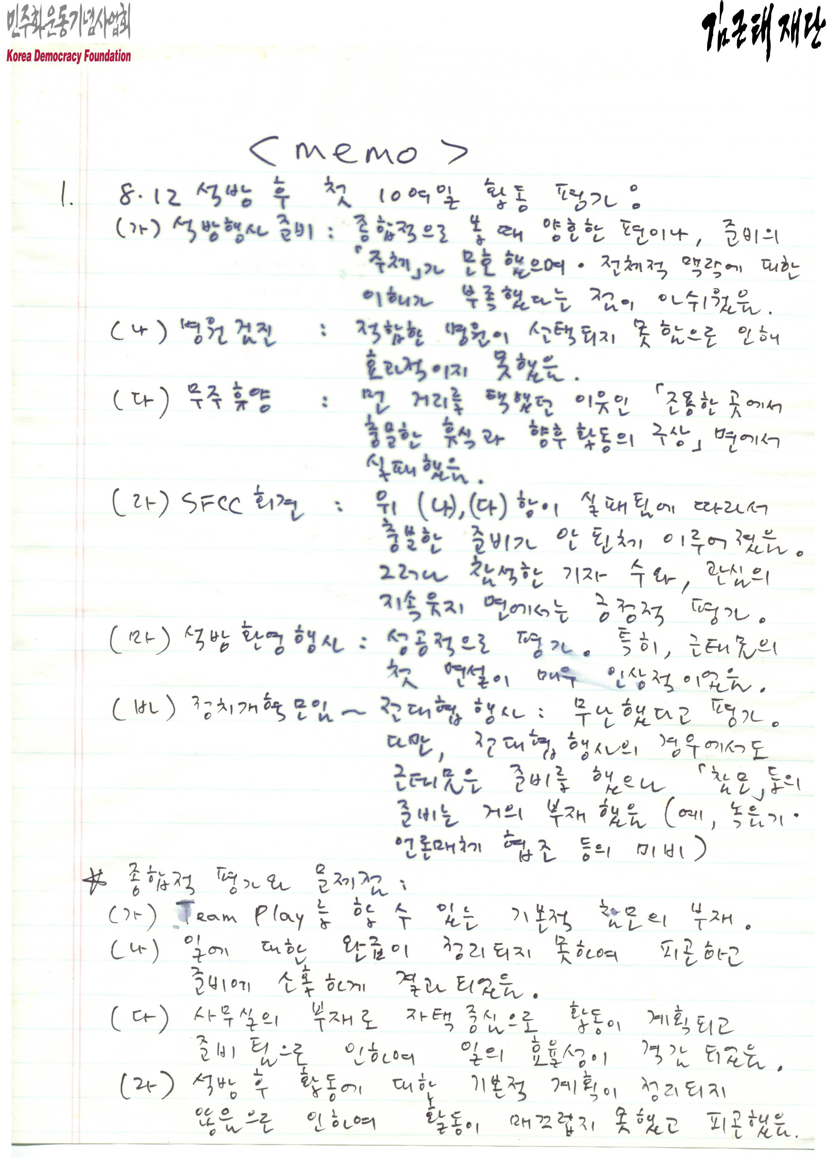 - 1992년 8월 12일 김근태의 석방 후 첫 10여일의 활동 평가를 자필로 작성한 문서로 사무실의 부재로 자택 중심으로 활동이 계획되었고 이에 일의 효율성이 경감되었다는 내용, 석방 후 활동에 대한 기본적 계획이 정리되지 않아 활동이 매끄럽지 못했고 피곤했다는 내용 등이 담겨 있음. 이에 비록 단기적이라도 기본적 참모와 활동계획, 활동공간의 확보가 필요하다는 점, 9월 초부터 100여일 동안의 활동계획의 기본적 스케줄의 작성이 필요하다는 점 등의 대책방안을 제시하였음