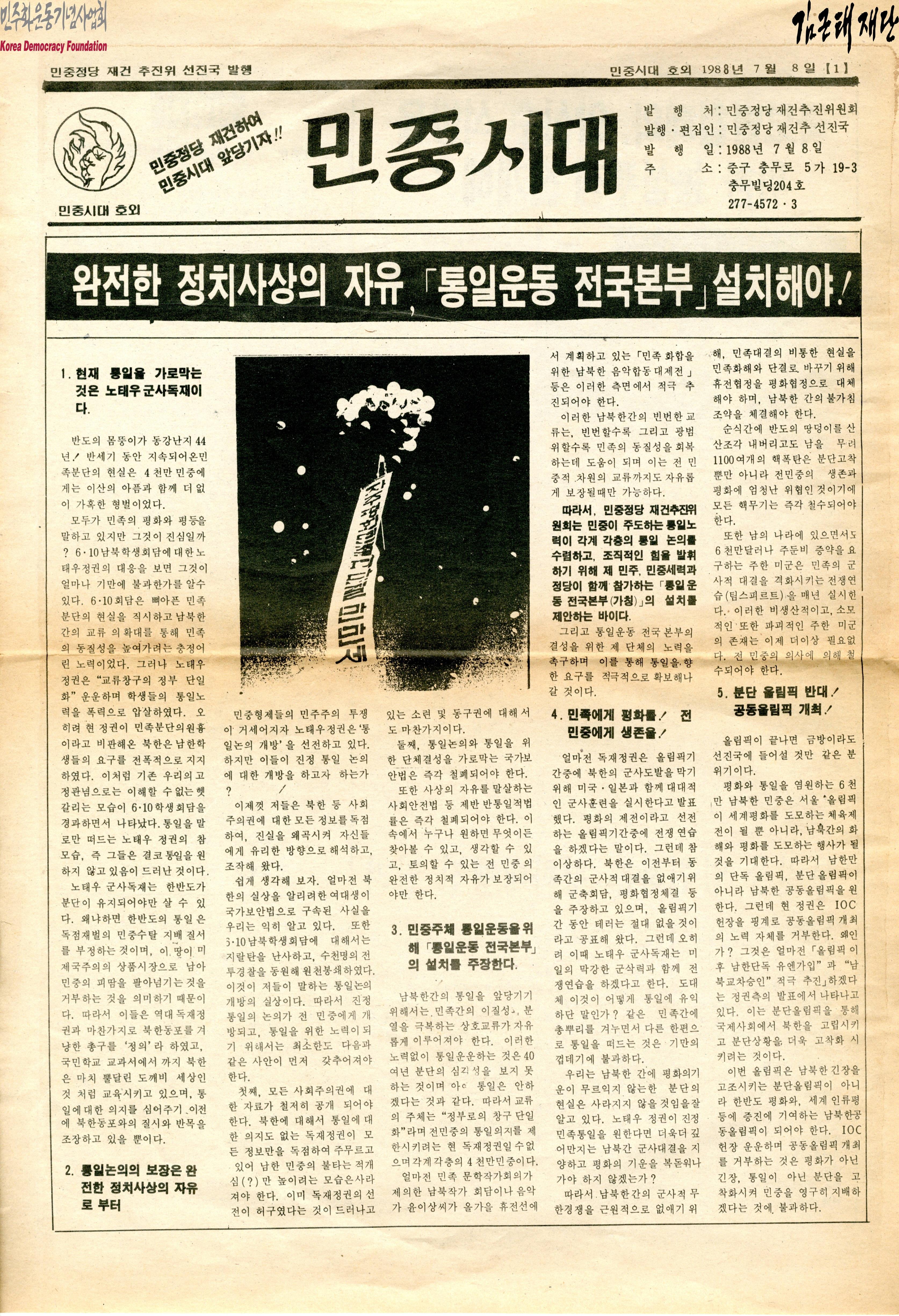 - 1988년 7월 8일 민중정당 재건 추진위 선진국에서 발행한 문서로 민중정당 재건추진위원회가 민중주체 통일운동을 위해 통일운동 전국본부의 설치를 제안하며, 사회안전법, 제반 반통일적법률의 즉각 철폐와 분단올림픽이 아닌 남북한올림픽의 개최를 촉구하는 내용, 노태우의 7.7선언에 대한 재건위의 입장문 등이 포함되어 있음. 김근태가 국보법 철폐 및 양심수 석방을 위한 농성투쟁을 이끌었다는 내용이 포함되어 있음