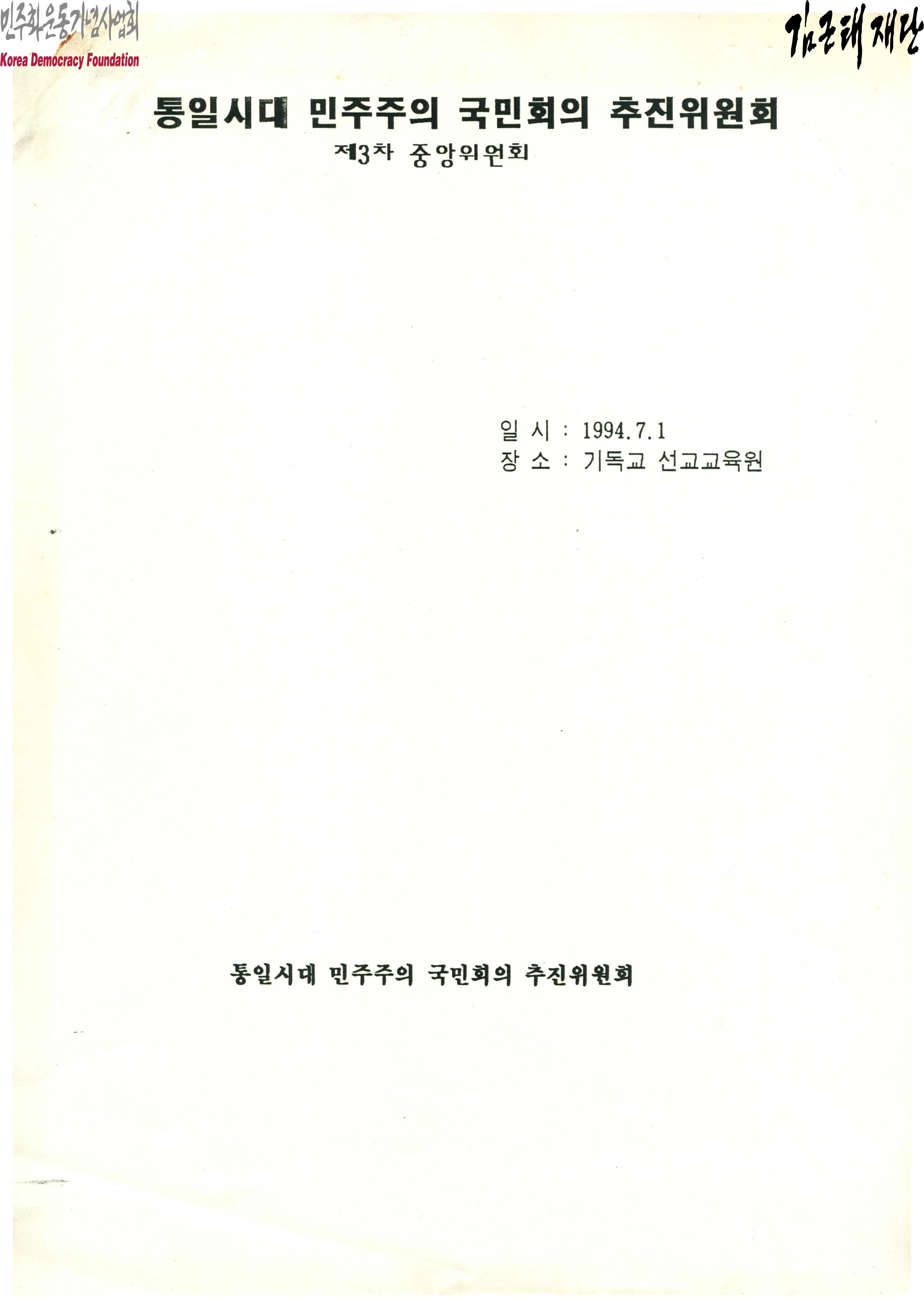 - 1994년 7월 1일 통일시대 민주주의 국민회의 추진위원회에서 작성한 제3차 중앙위원회 개최 관련 문서로 제2차 중앙위원회의 결과를 보고하는 내용, 6월 사업보고와 7월 사업계획 내용, 지방자치 선거대책과 남북정상회담 등과 관련한 토의 안건 보고 등 관련 내용이 포함되어 있음. 김근태 대표와 이기택 민주당 대표의 회동 결과와 발표문 전문이 포함되어 있음.