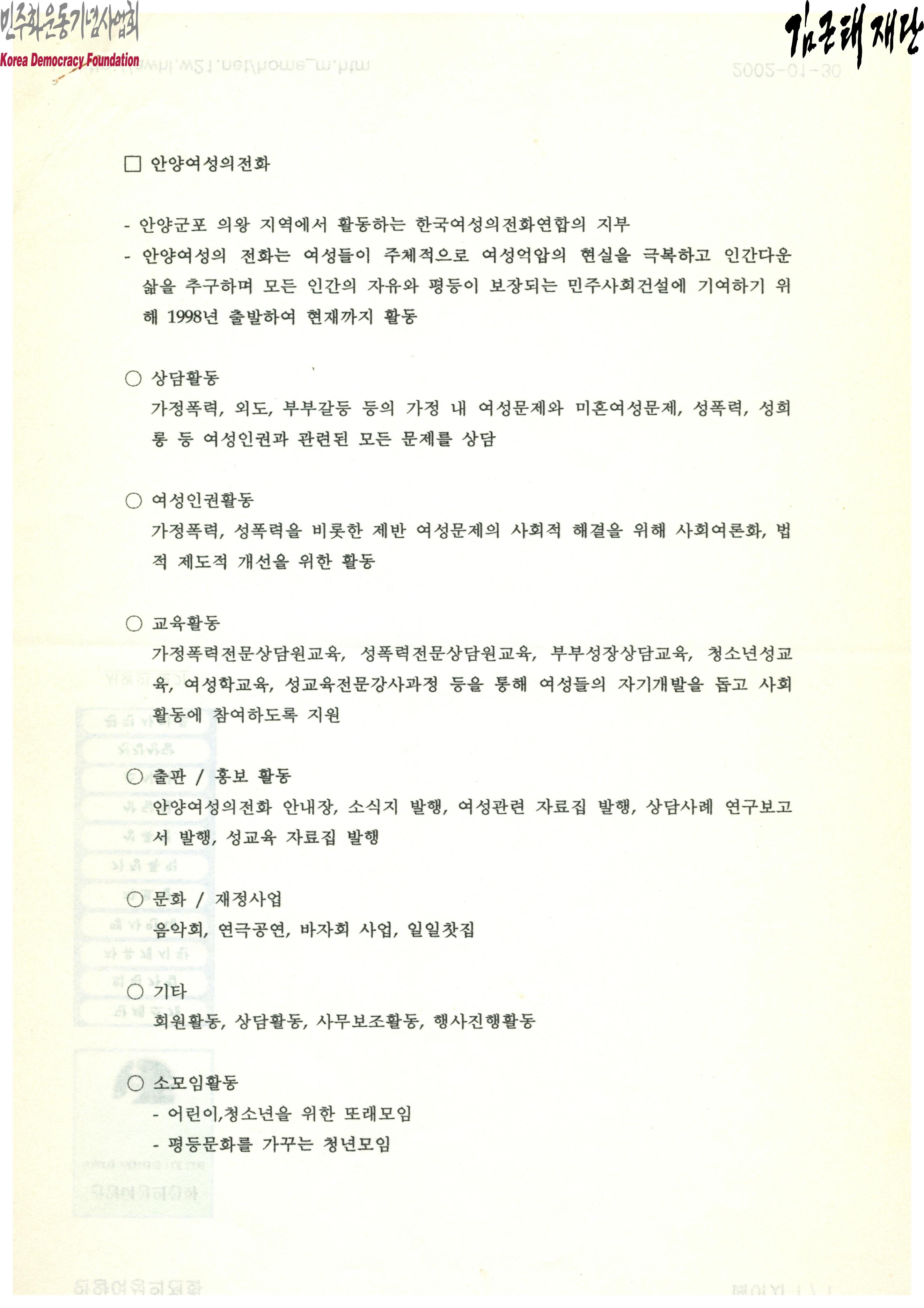 - 안양여성의전화의 각종 활동과 사업, 상담소를 소개하는 내용과 가정폭력과 성폭력, 청소년의 성보호에 관한 법률 등의 정의와 실태에 관하여 서술한 내용 등이 포함되어 있음