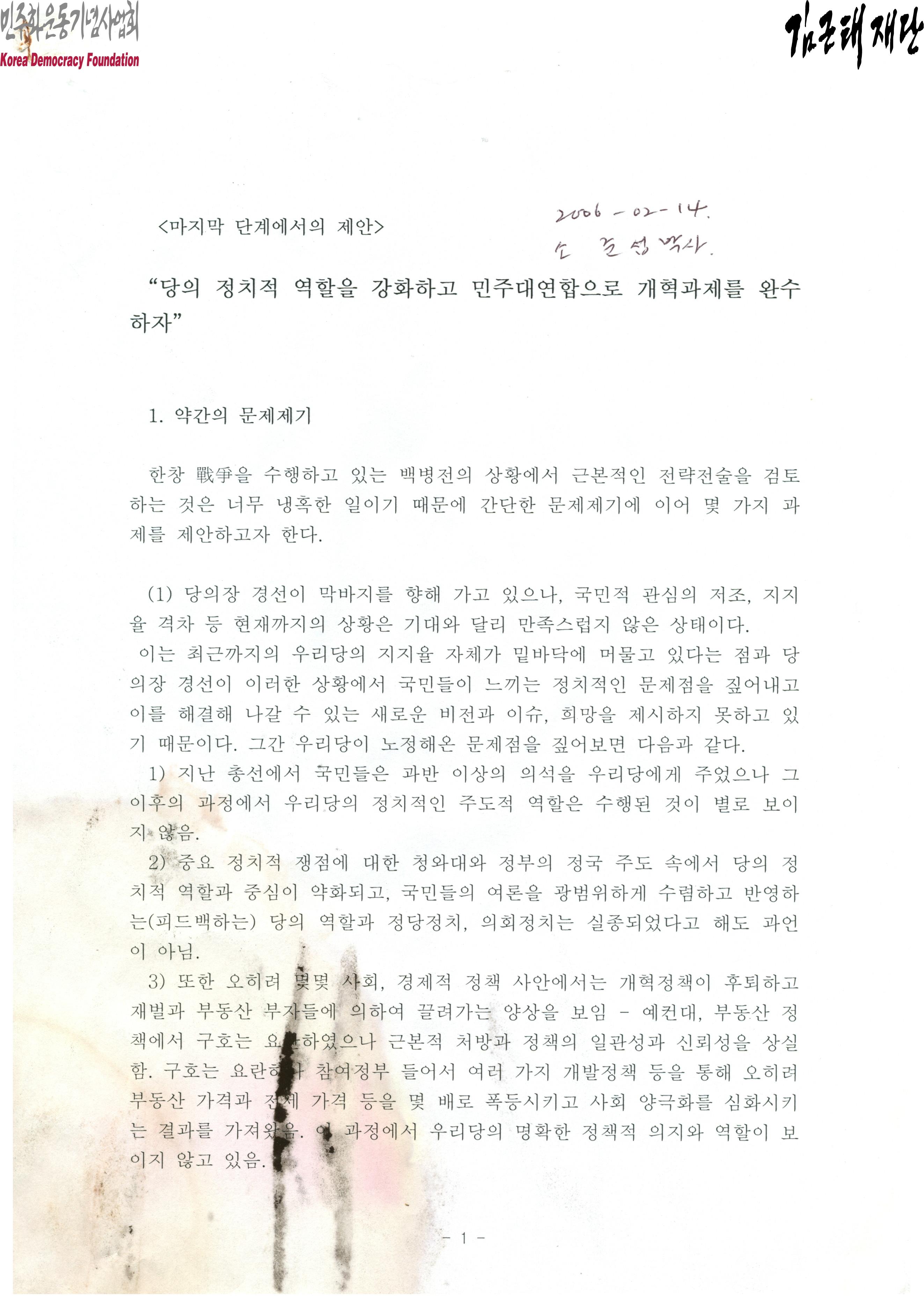 - 2006년 2월 14일 소준섭 박사가 작성한 :당의 정치적 역할을 강화하고 민주대연합으로 개혁과제를 완수하자"라는 제목의 문서로 당의장 경선에 대한 국민의 관심이 저조하며 지지율 격차가 크다는 등의 이유를 들어 기대와 달리 현 상황이 만족스럽지 않다는 내용 등이 포함되어 있음