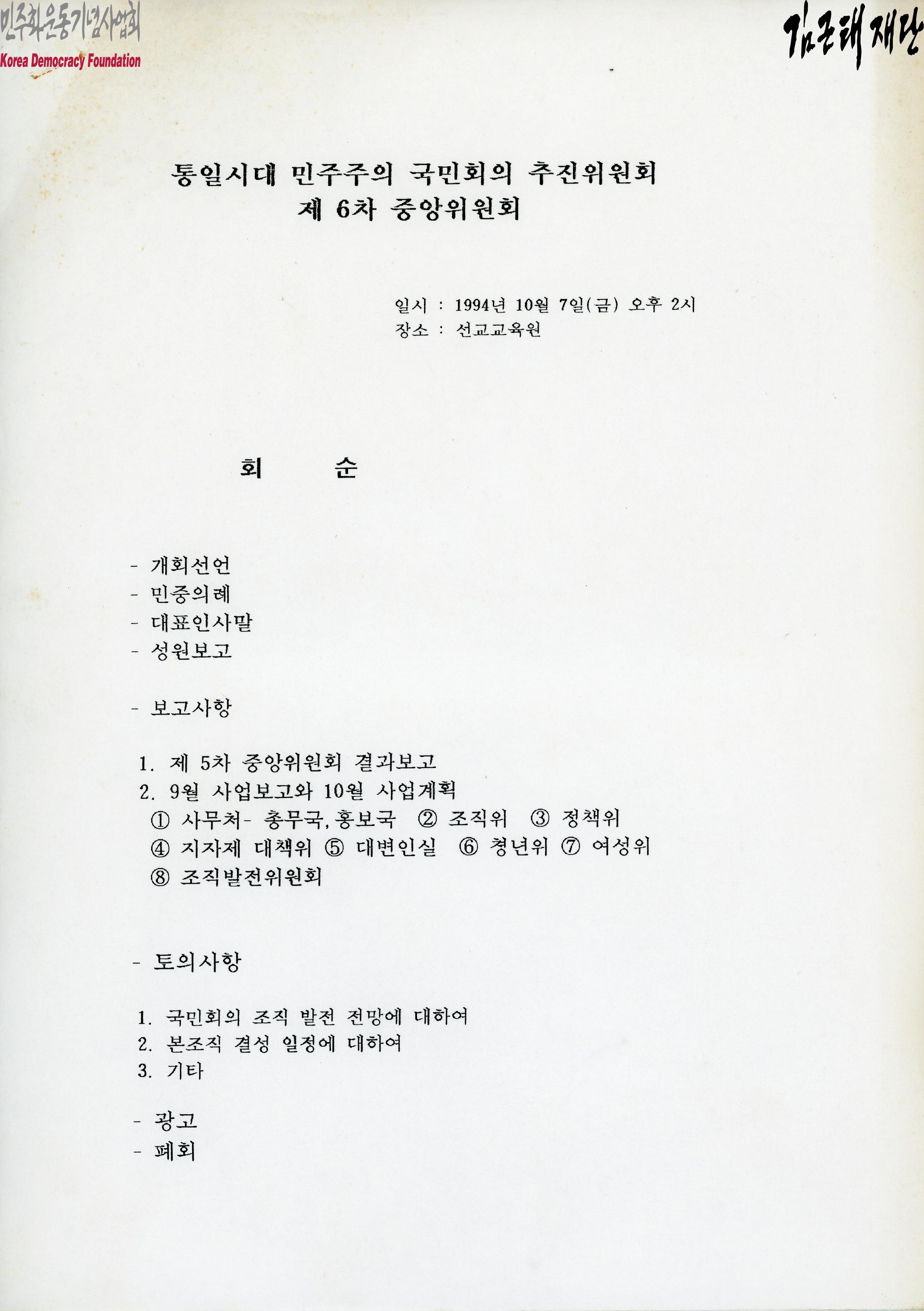 - 1994년 10월 7일 통일시대 민주주의 국민회의 추진위원회 제 6차 중앙위원회와 관련하여 제작된 문서로 회순, 보고사항, 9월 사업보고와 10월 사업계획, 토의사항 등이 포함되어 있음. 맨 뒷면에 ''북핵, 성명조직 후 -> 다른 사안으로 연결'', ''※ 노동문제. 중재 등 -> 시도했었는데 이·방 -> line 가중 X Timing 놓쳤음'' 등이 적혀있음