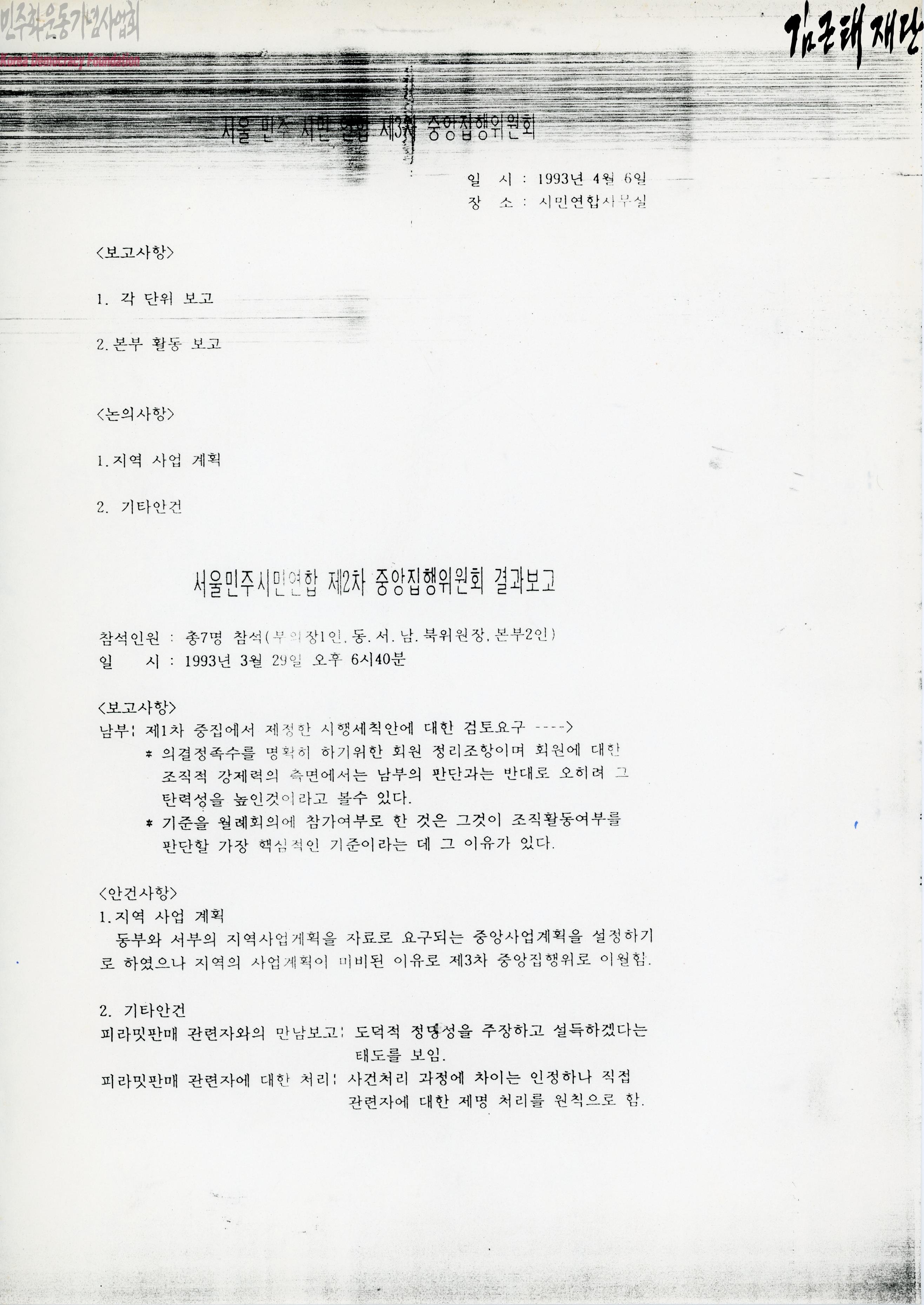 - 1993년 4월 6일 서울민주시민연합 제3차 중앙집행위원회와 관련한 문서로 동·서부 지역 사업 계획, 피라밋판내 관련자와의 만남, 서부의 93년 사업계획, 소모임활동에 관하여 등이 포함되어 있음. 맨 뒷면에 자필로 ''동부 사업계획.'' ''·조직 정체현상.'', ''·지역운동이 차지하는 지위와 역할 서울지역'', ''주민운동의 전문화의 필요성'' 등이 적혀있음