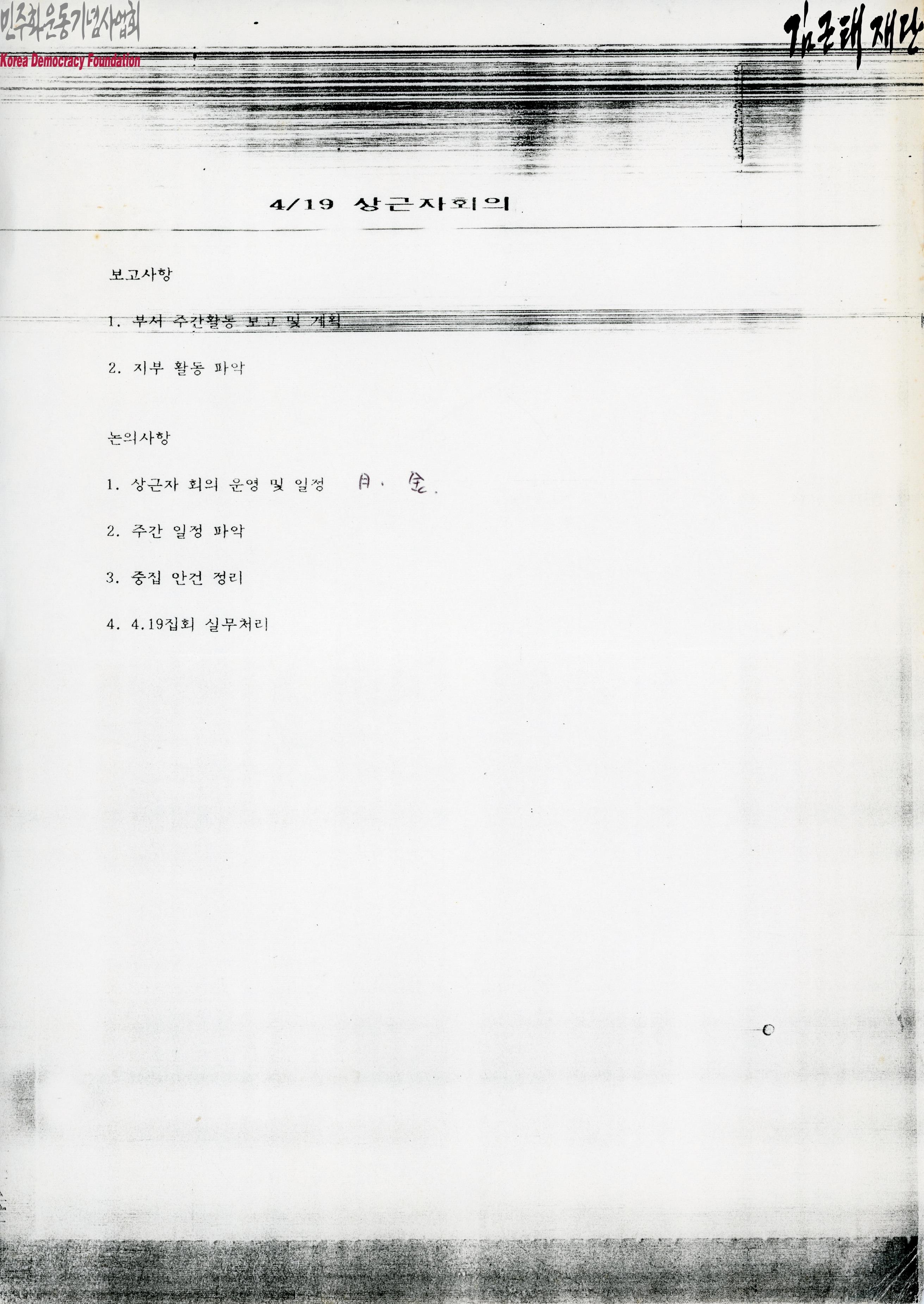 - 4월 19일 상근자회의에 관련해 작성된 문서로 부서 주간활동 보고 및 계획, 지부 활동 파악과 같은 보고사항과 상근자 회의 운영 및 일정, 주간 일정 파악 등과 같은 논의사항이 포함되어 있음