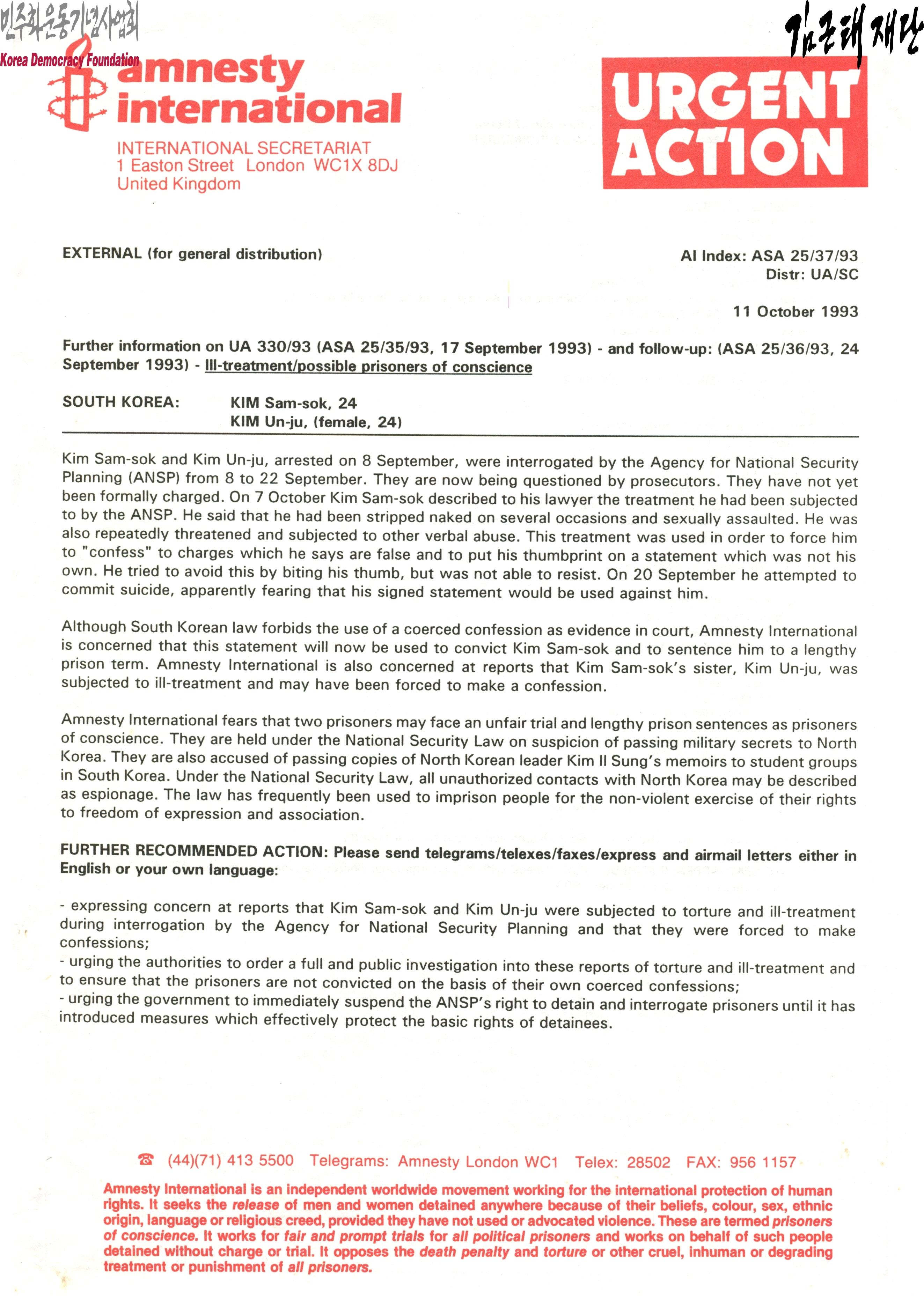 - 1993년 10월 11일 AMNESTY INTERNATIONAL에서 작성한 문서로 김삼석, 김운주에 관한 글로 김삼석과 김운주는 국가안전기획부의 심문을 받았으며, 김삼석은 변호사에게 국가안전기획부에서 받았던 성폭행을 말했고, 협박과 언어폭력을 당했으며, 거짓 진술을 하라고 압박을 받았다는 내용과 국제사면위원회에서는 김삼석과 김운주에게 양심수로 채택하였으나, 이 둘은 국가보안법상 대북 무허가 접촉 등 간첩행위를 했다 등의 죄명으로 체포되어 있다 등의 내용이 포함되어 있음