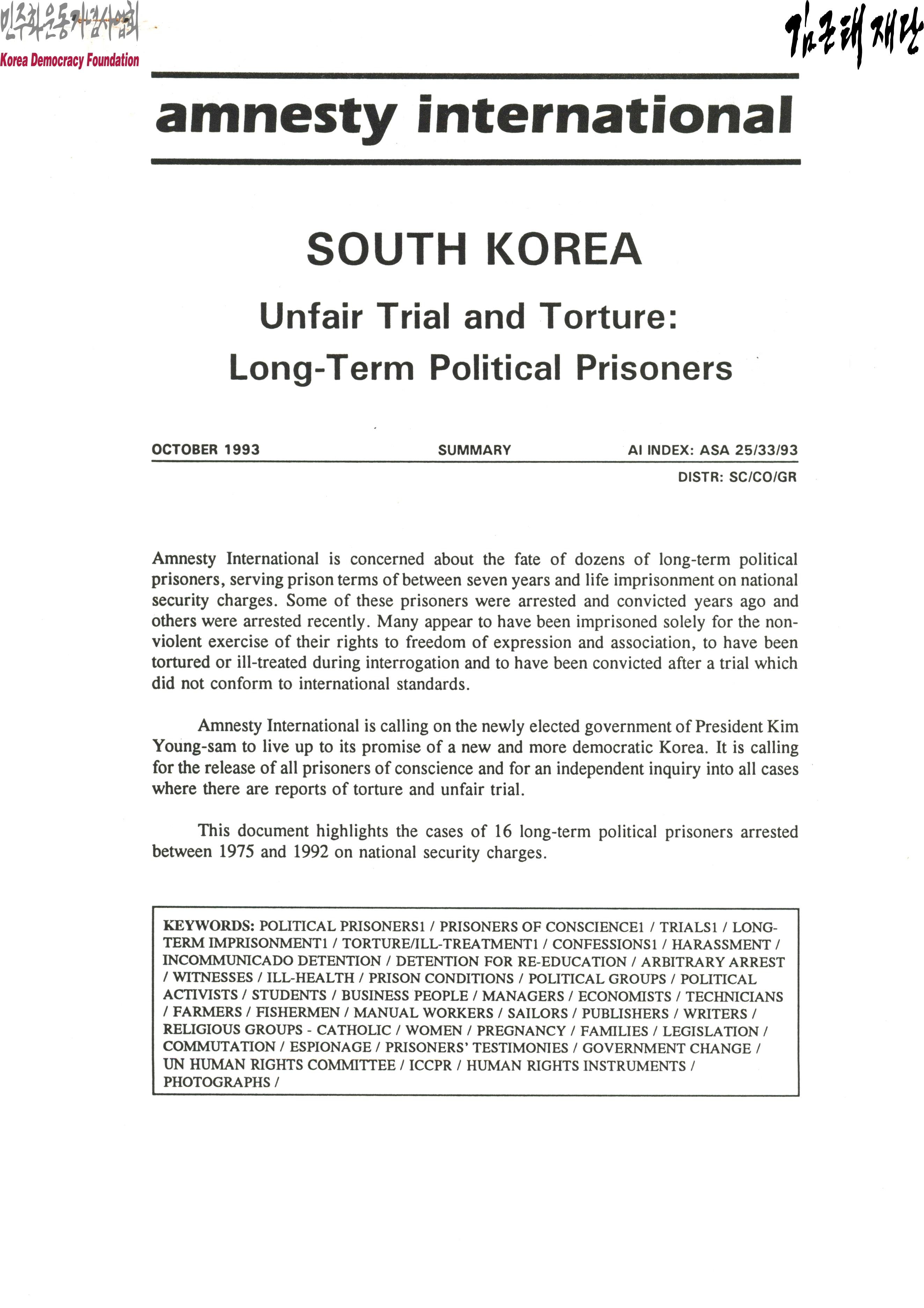 - 1993년 10월 AMNESTY INTERNATIONAL에서 작성한 문서로 국제사면위원회는 새정부인 김영삼정부에게 새롭고 더 민주적인 한국이라는 약속을 지킬 것을 요구하며, 모든 양심수 석방과 고문과 불공정한 재판의 보고가 있는 모든 사건에 대한 독립적인 조사를 요구하는 내용과 1975년부터 1992년까지 한국에서 국가 안보 혐의로 체포된 16명의 장기 ㅈ정치범 사례에 대한 내용 등이 포함되어 있음