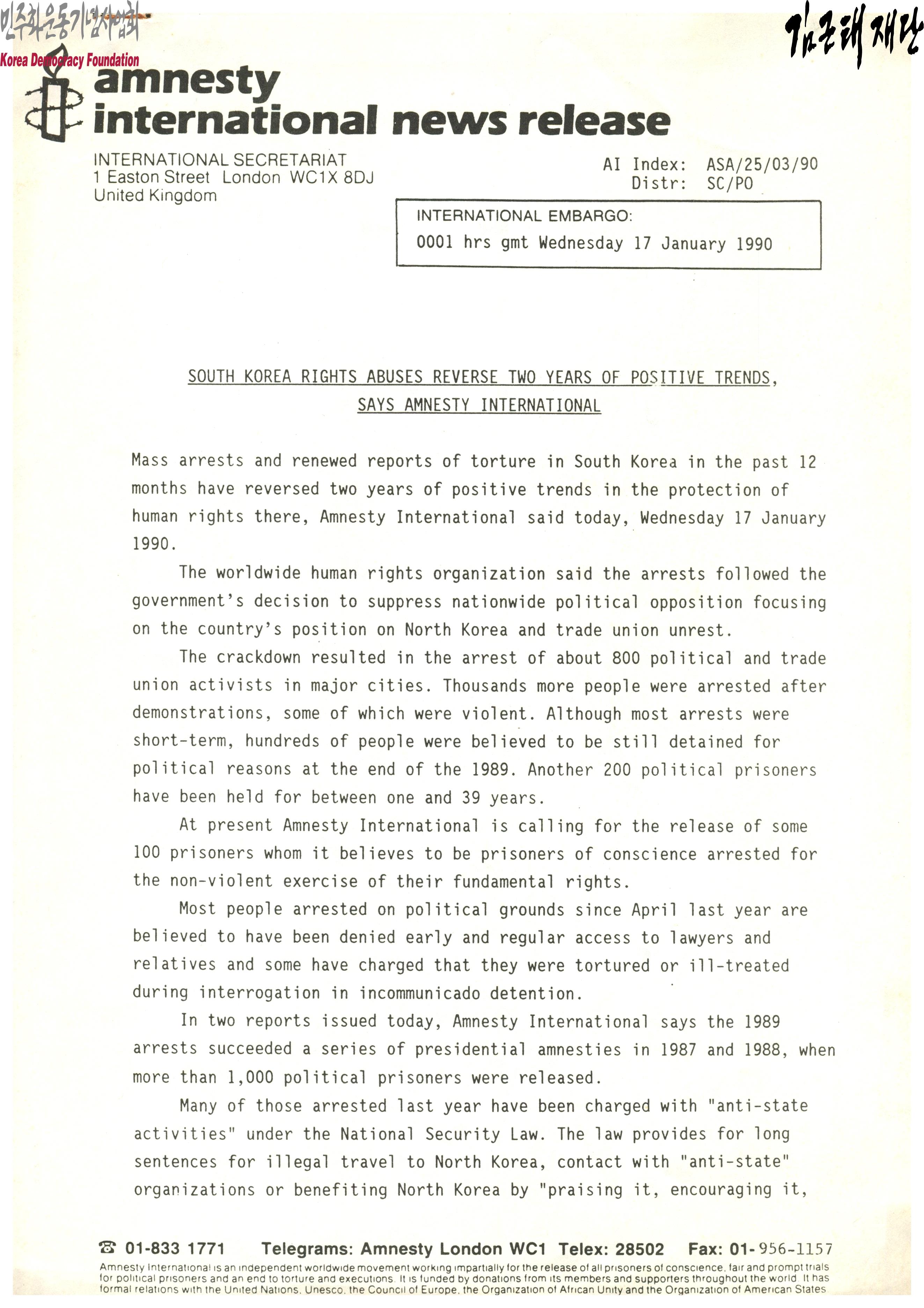 - AMNESTY INTERNATIONAL에서 작성한 문서로 국제 사면위원회에서는 지난 12달에 걸쳐 남한에서 있었던 집단체포와 다시 보도되는 고문은 과거 2년간 인권보호의 적극적인 추세에서 후퇴하였다고 말하며, 전국에 걸쳐 정치적 저항을 억압하려는 정부의 결정에 따라 체포가 시행되었다는 내용과 현재 국제사면위원회는 기본적 인권을 비폭력적으로 시행한 이유로 체포된 양심범으로 믿어지는 100여명 죄수의 석방을 요구한다와 관계당국이 유치자에 대한 고문과 학대를 예방하는 1987년 10월헌법에 의한 보장과 1987년 과 1988년에 소개된 기타조치를 일부러 무시하였다고 지적하였다 등의 한국정부의 정치범 구속과 양심범 석방 요구 등이 내용에 포함되어 있음. 영어 원문과 한국어 번역본이 포함되어 있음