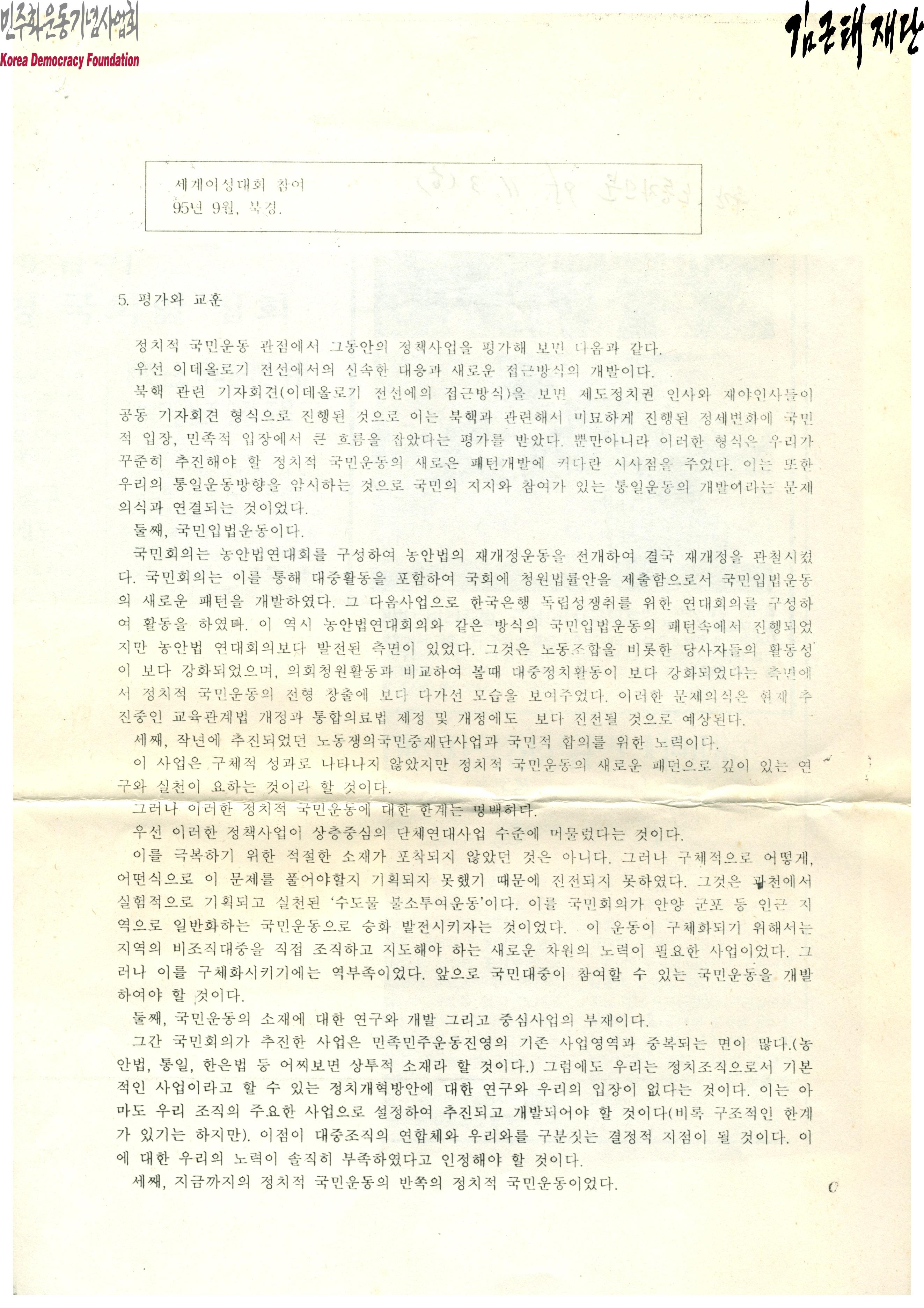 - 1995년 9월 북경에서 열린 세계여생대회 참여에 대한 내용이 적힌 문서로 정치적 국민운동 관점에서 그동안의 정책사업을 평가하면 이데올로기 전선에서의 신속한 대응과 새로운 접근방식 개발, 국민입법운동, 작년에 추진되었던 노동쟁의 국민중재단사업과 국민적 합의를 위한 노력 등의 평가와 교훈에 대한 내용 등이 포함되어 있음