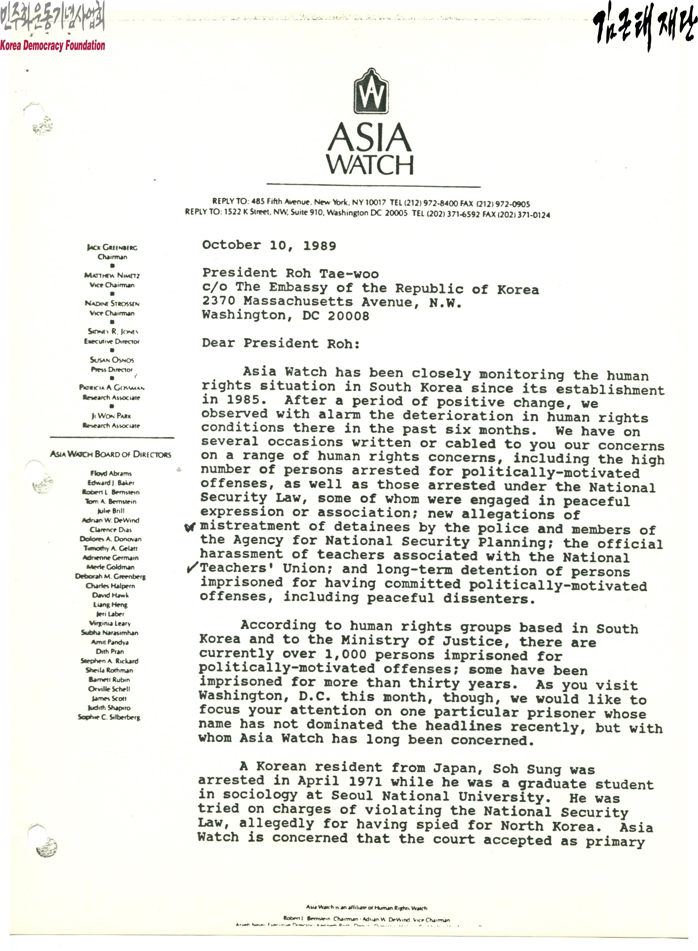 - 1989년 10월 10일 ASIA WATCH 전무이사 시드니 존스가 노태우에게 보내는 서신으로 ASIA WATCH는 한국의 인권사항을 면밀히 주시해 왔으며, 우리는 지난 6개월 동안 한국의 인권상황이 악화에 대해 경각심을 가지고 관찰했으며, 국가보안법 따라 체포된 사람들 중 일부는 평화적인 표션이나 연합에 종사하고 있는 인원들이며 이들에 대한 인권문제가 적힌 서면을 여러 차례로 보냈고 또 전보쳤다는 내용과 이들의 무조건 석방을 요구하며, 이번 미국 방문을 계기로 정치적인 개혁과 인권존중의 길로 나아갔으면 바란다 등의 내용이 포함되어 있음.
