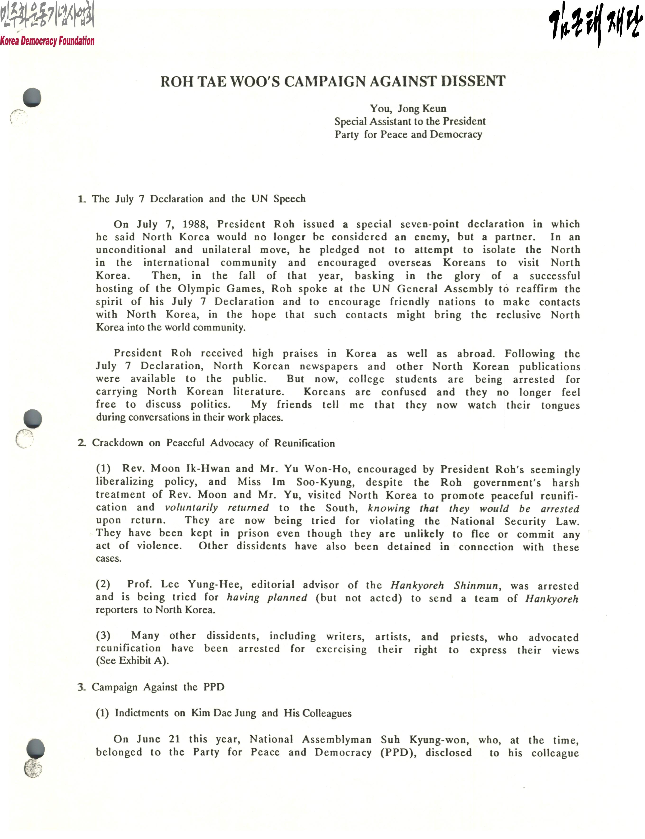 - 평화민주당의 특별보좌관 유종근이 작성한 문서로 노태우의 7월선언과 유엔연설, 철처한 통일 옹호 단속, 평화민주당 반대 정처직 활동, 인권침해 등 노태우의 정치적 활동에 대해 반대한다 등의 내용이 포함되어 있음.