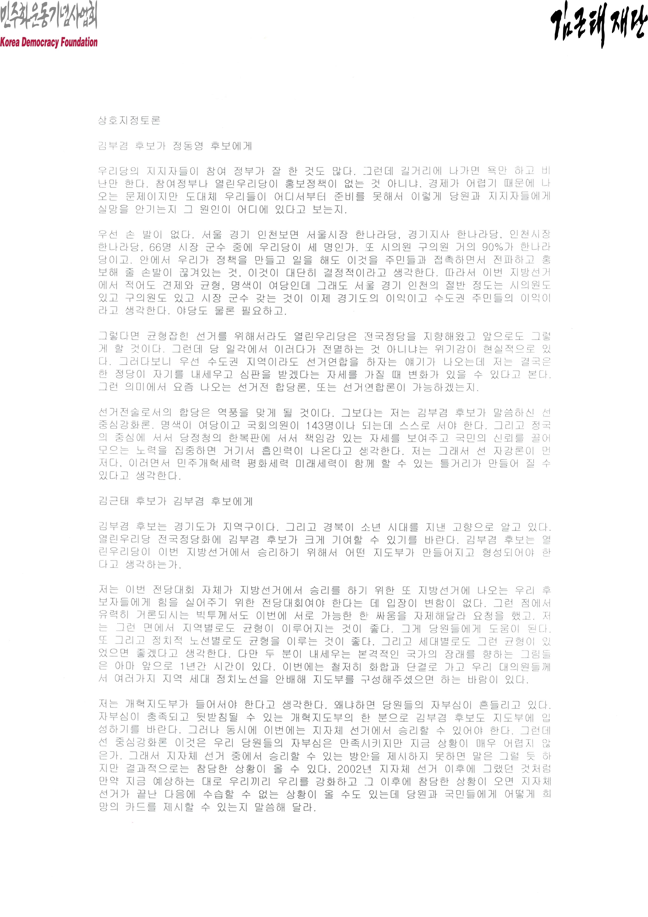 - 김근태, 김부겸, 정동의 상호지정토론 문서로 임시번호 9484 신용카드매출 등 과소신고에 따른 안내문 4페이지 뒷면에 있음. 김부겸 후보가 정동영 후보에게 우리달의 지지자들이 참여 정부가 잘 한 것도 많다. 그런데 비난만하고, 참여정부나 열린우리당이 홍보정책이 없는 것이 아니냐와 선거 전술로서의 합당은 역풍을 맞게 될 것이다 등의 내용과 김근태 후보가 김부겸 후보에게 이번 전당대회 자체가 지방선거에서 승리를 하기 위한 또 지방선거에 나오는 우리 후보자들에게 힘을 실어주기 위한 전당대회여야 한다는 데 입장이 변함이 없으며, 저는 개혁지도부가 들어서야 한다고 생각하며, 동시에 이번에는 지자체 선거에서 승리 할 수 있어야 한다 등의 내용이 포함되어 있음