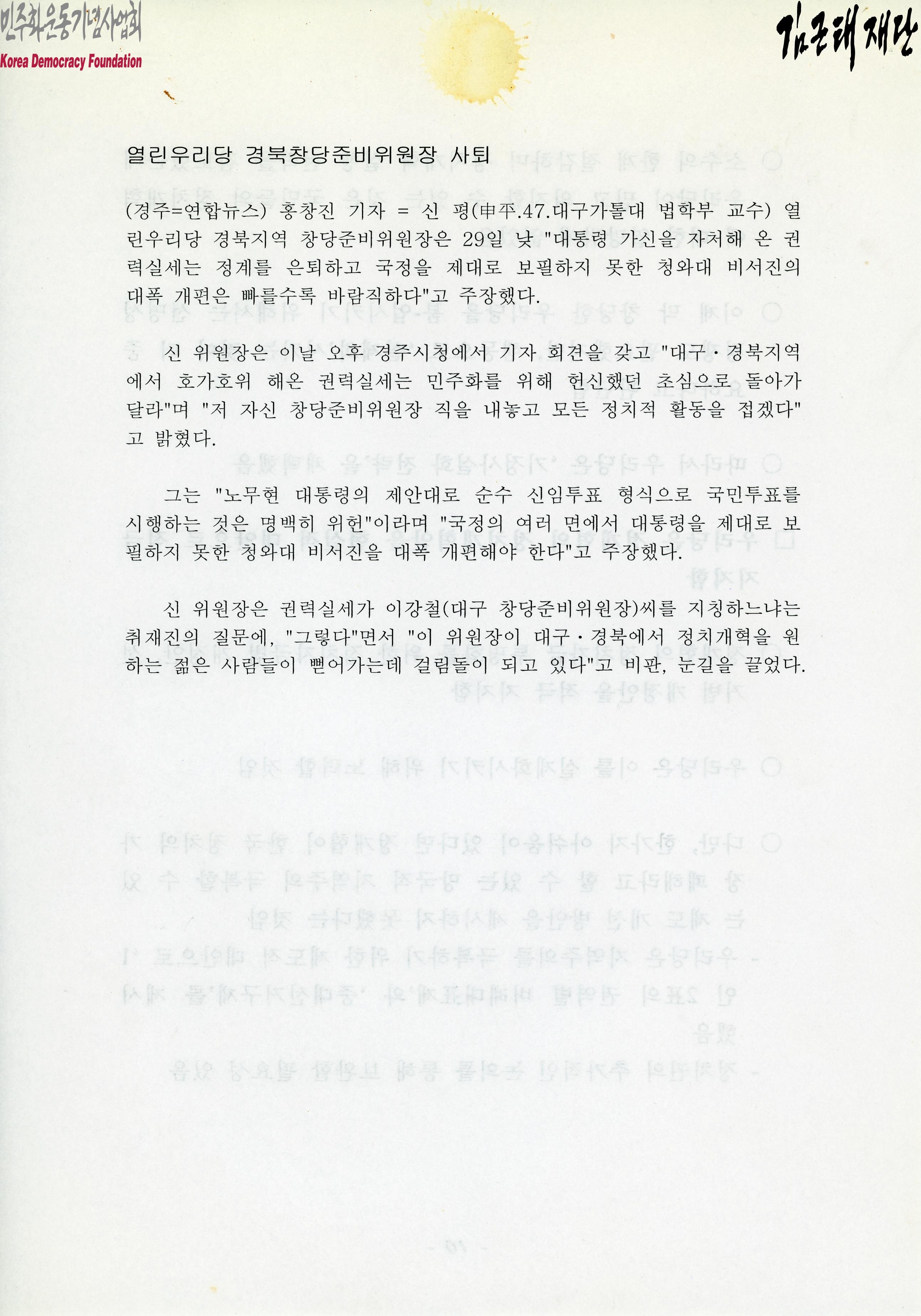 [신문스크랩]열린우리당 경북창당준비위원장 사퇴