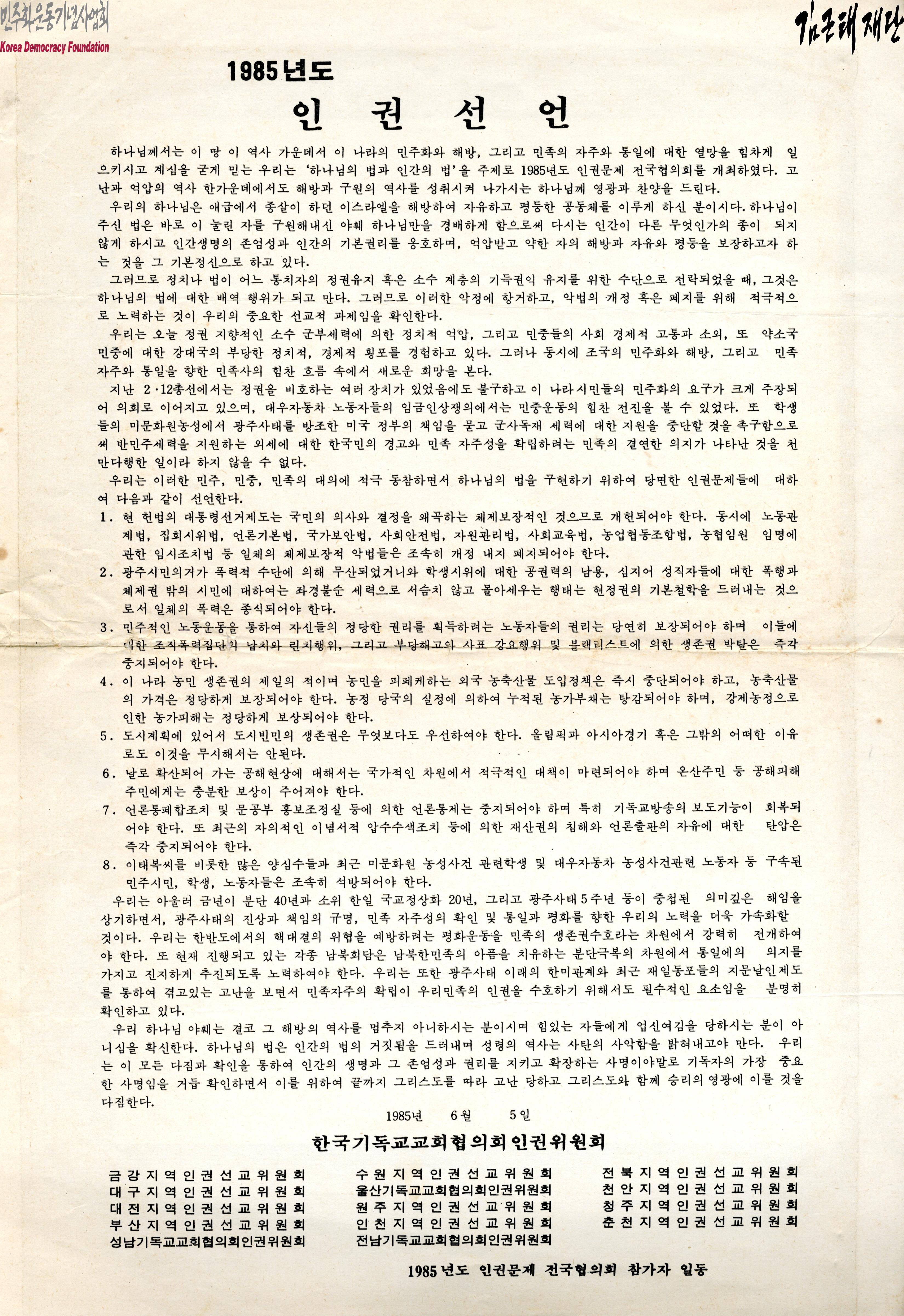 - 1985년 6월 5일 한국기독교교회협의회 인권위원회에서 작성한 문서로 현 헌법 대통령선거제는 국민의 의사와 결정을 왜곡하고 있으며 체제보장적 악법들은 조속히 개정 내지 폐지되어야 한다, 학생시위에 대한 공권력의 남용 및 성직자에 대한 폭행 등 일체의 폭력은 종식되어야 한다, 생존권을 침해하는 외국 농축산물 도입정책으로 인한 농가피해는 정당하게 보상되어야한다는 등의 요구가 포함되어야 있음